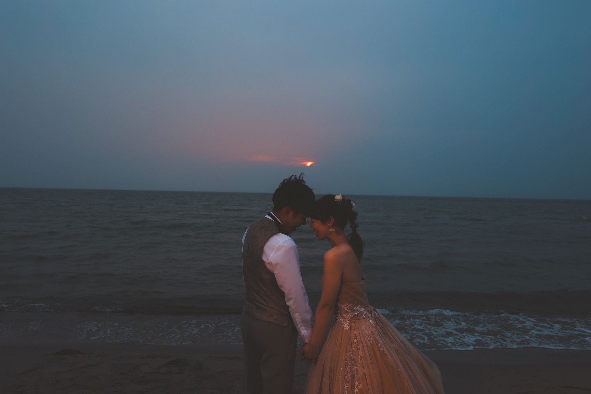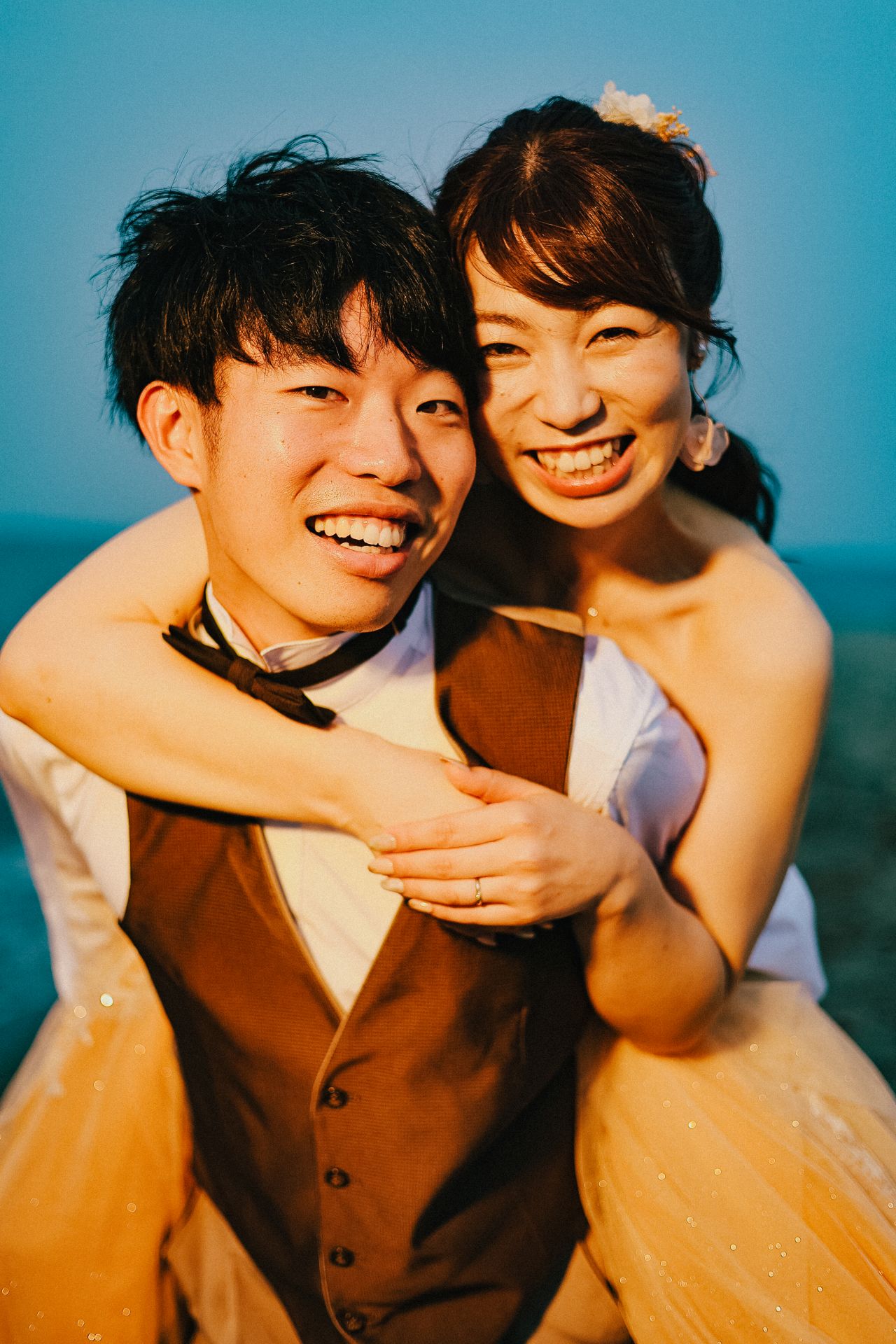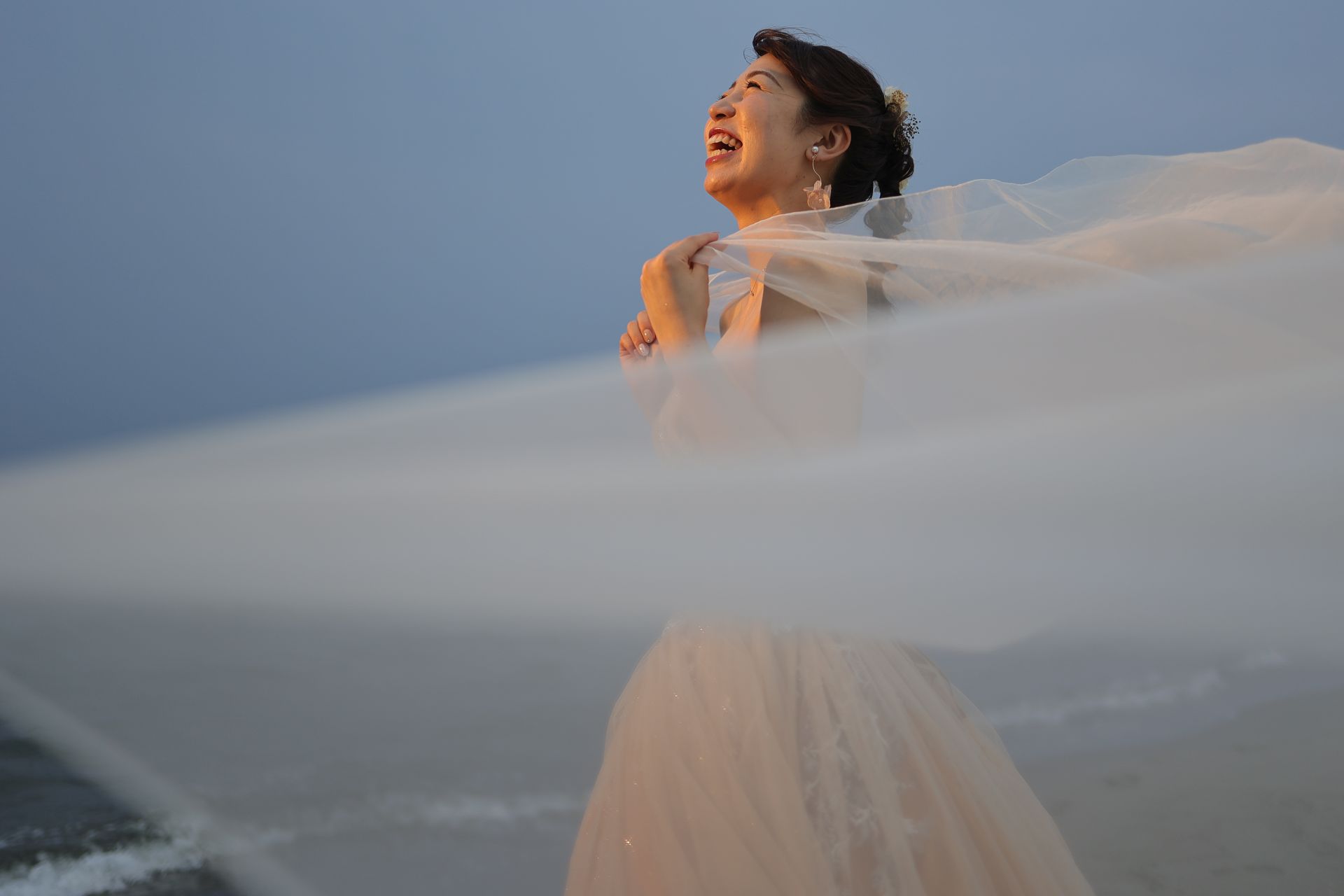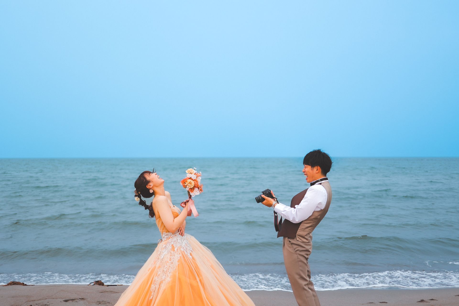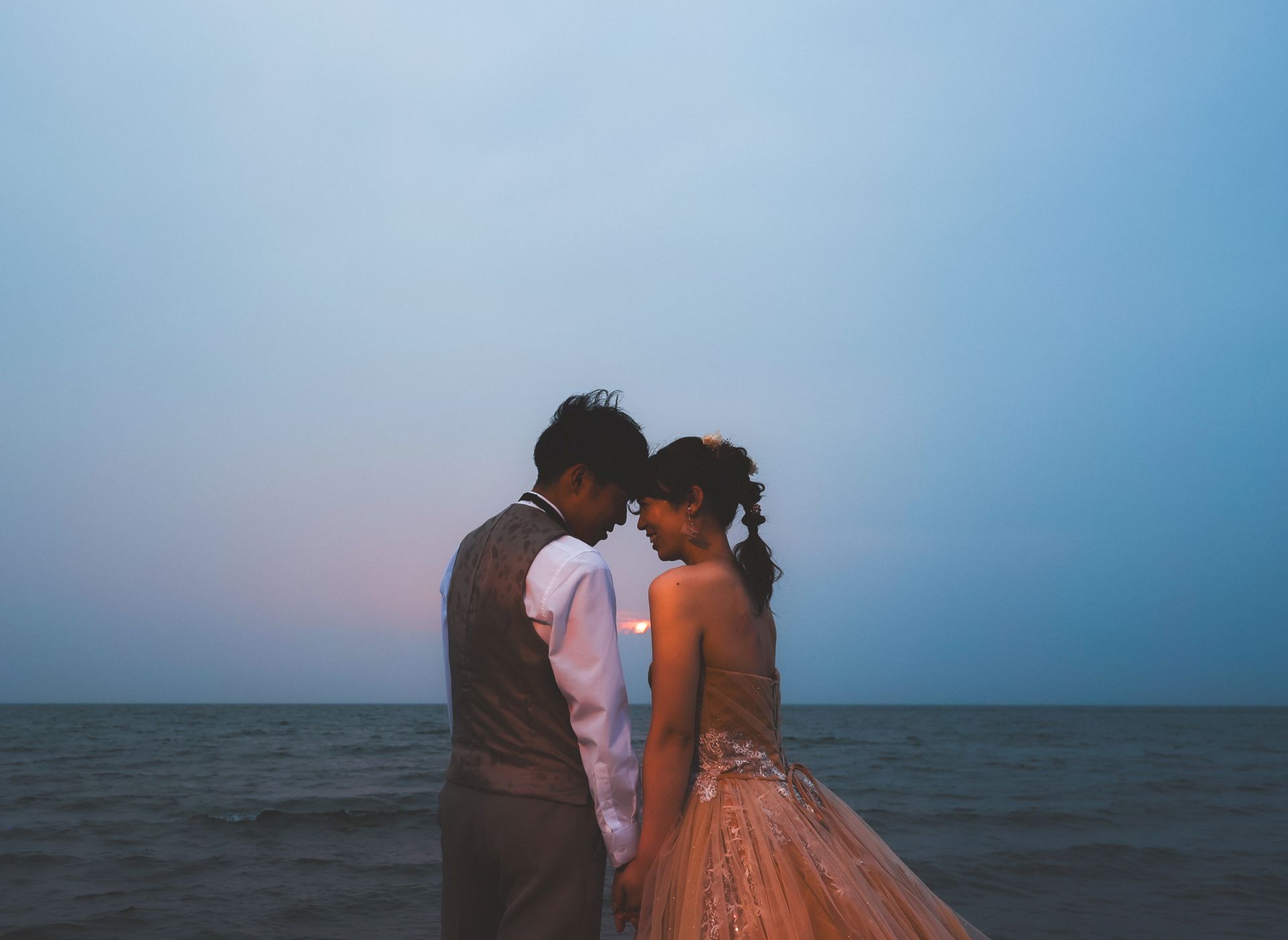 新潟の海辺、夕陽に包まれて 前撮りドレス ロケーションフォトドレス新潟ロケ海ロケ前撮りカラードレス 新潟の海辺、夕陽に包まれて 新潟の美しい海辺。夕暮れ時の柔らかな光が海と空を染め、まさに絶景の中での撮影となりました。 お二人の笑顔がとても印象的で、自然な表情が写真に溢れています。特に、夕日の優しい光が二人の表情を引き立て、温かみのある素敵に仕上がりました。 海辺の風や波の音も心地よく、リラックスした雰囲気の中で前撮りでした。思い出に残る、最高のひとときとなりました。