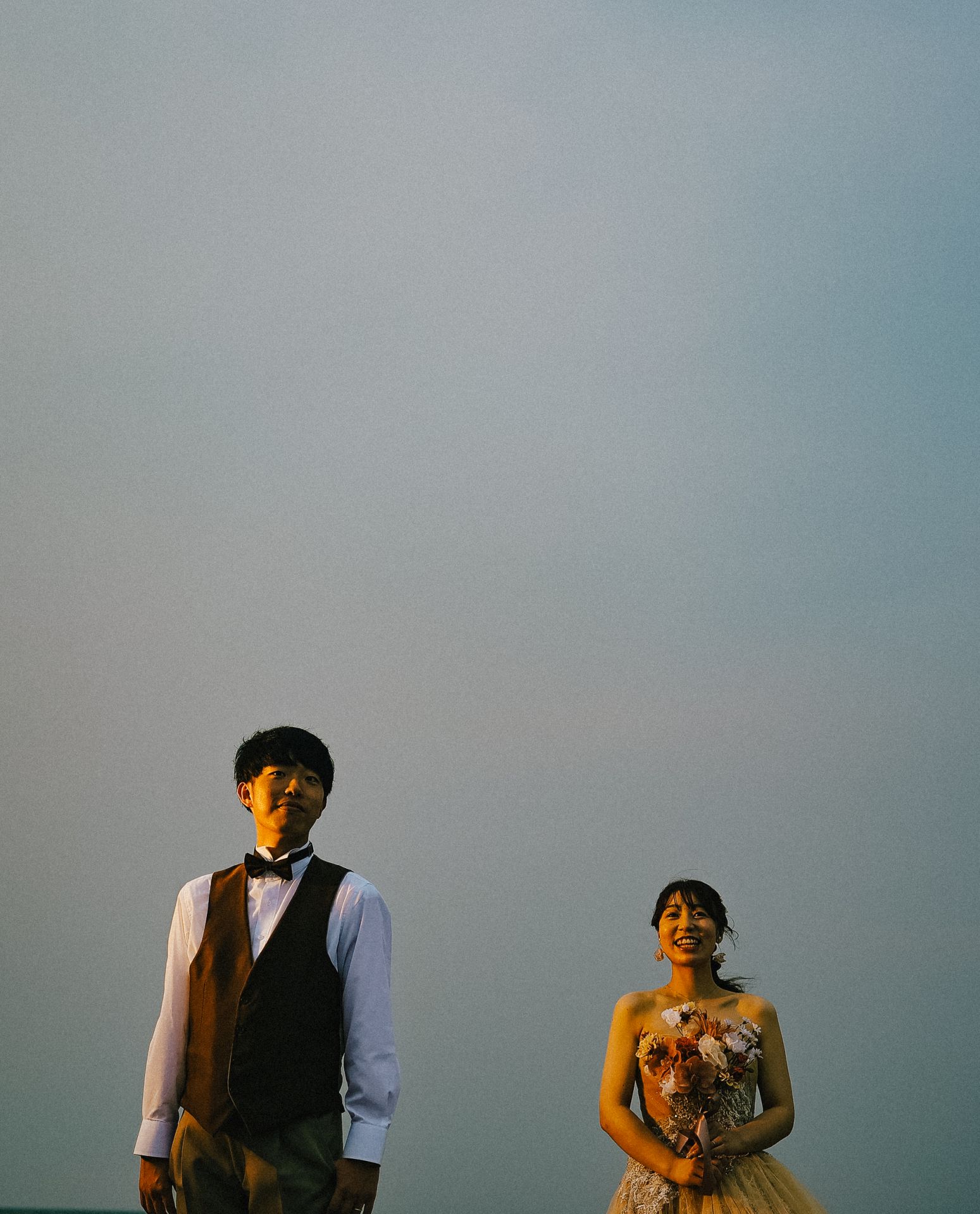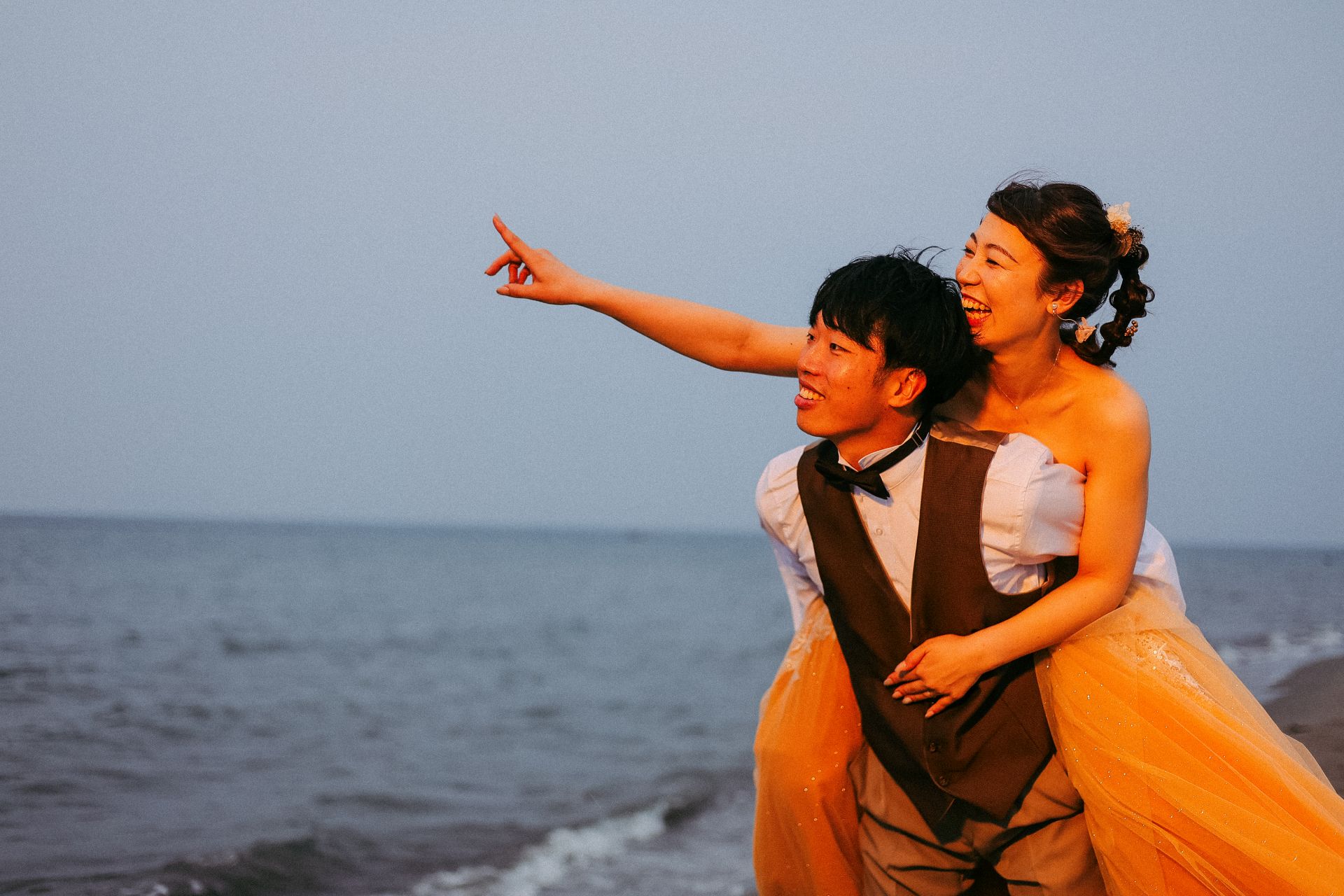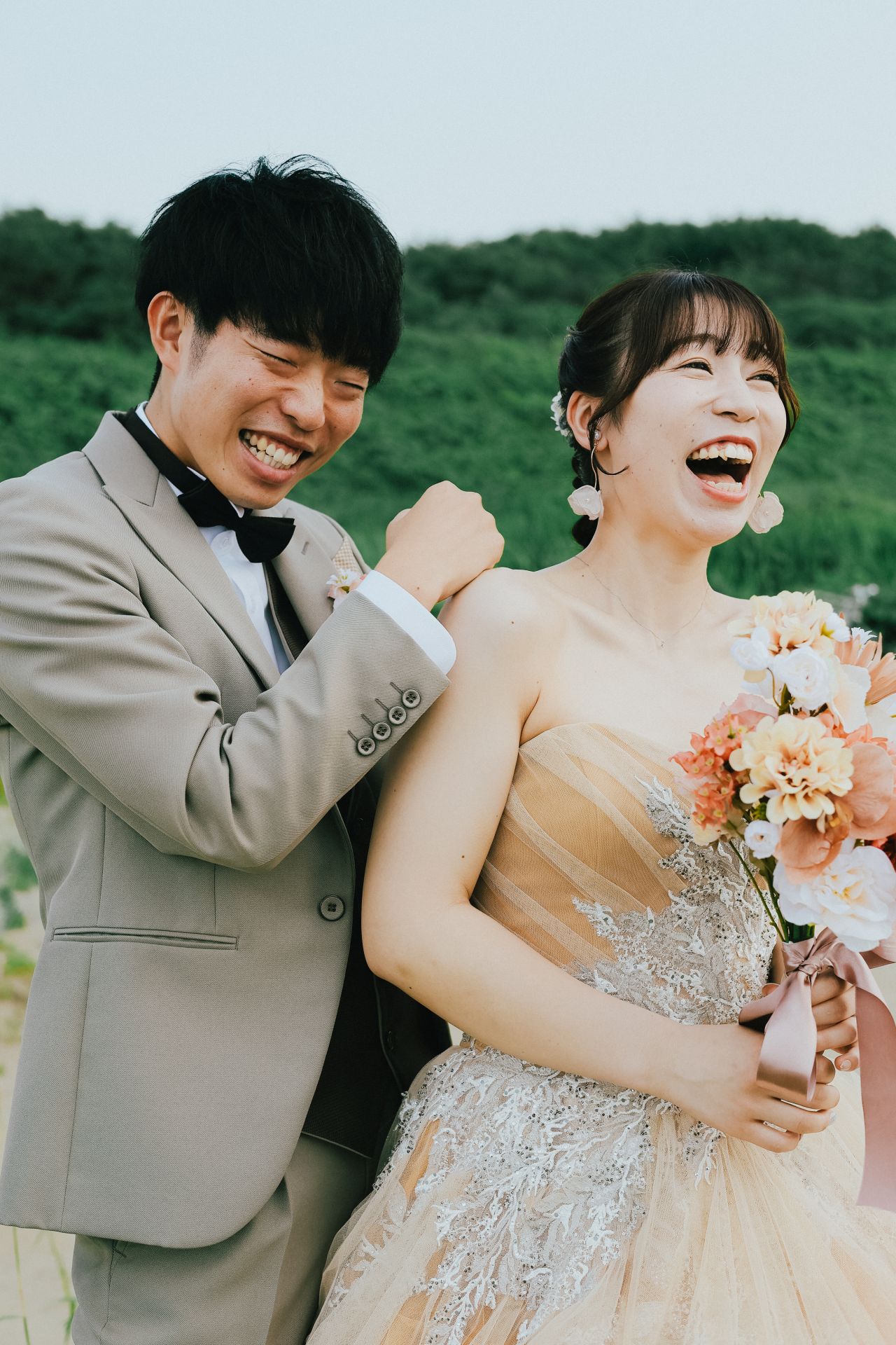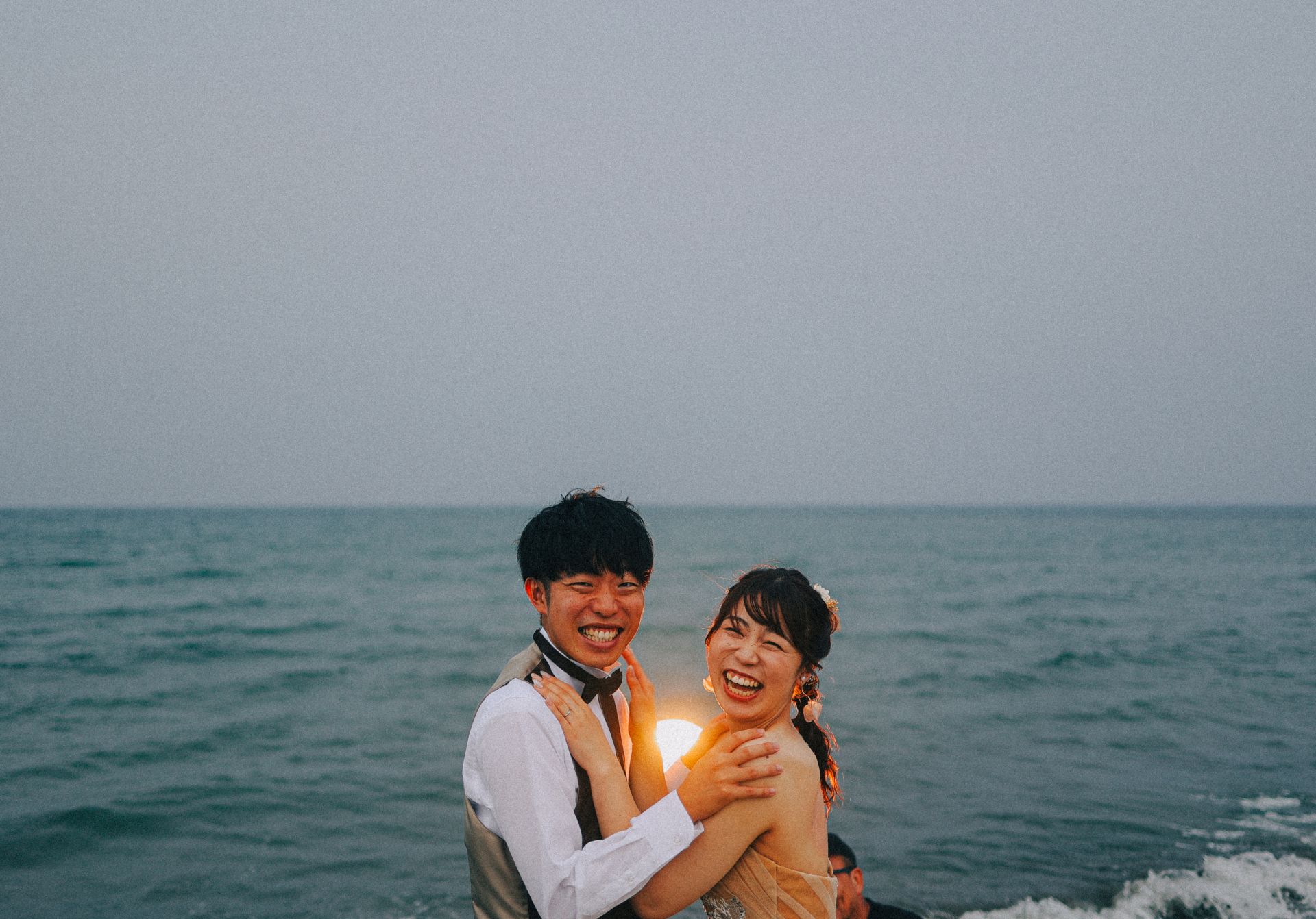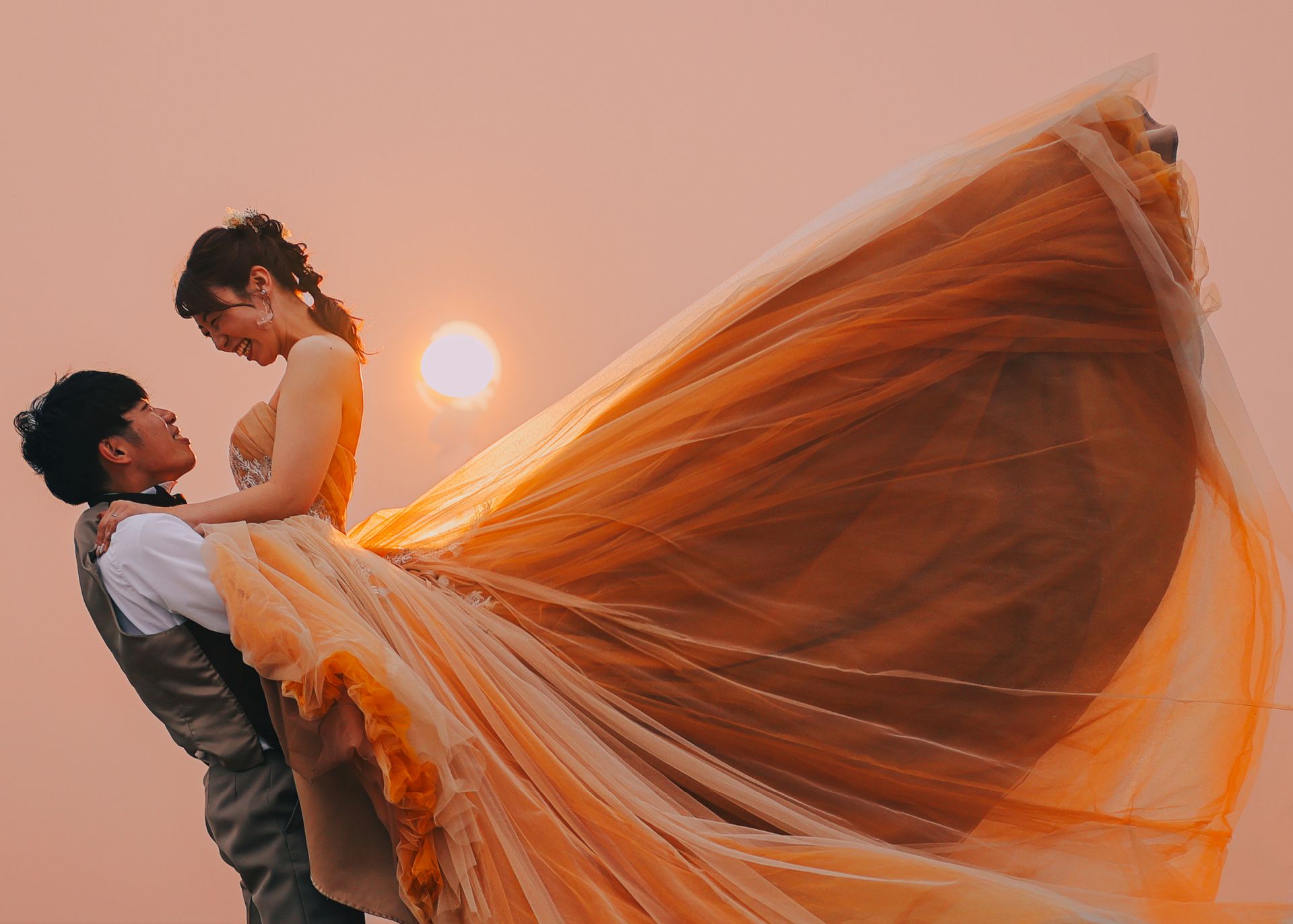 新潟の海辺、夕陽に包まれて 前撮りドレス ロケーションフォトドレス新潟ロケ海ロケ前撮りカラードレス 新潟の海辺、夕陽に包まれて 新潟の美しい海辺。夕暮れ時の柔らかな光が海と空を染め、まさに絶景の中での撮影となりました。 お二人の笑顔がとても印象的で、自然な表情が写真に溢れています。特に、夕日の優しい光が二人の表情を引き立て、温かみのある素敵に仕上がりました。 海辺の風や波の音も心地よく、リラックスした雰囲気の中で前撮りでした。思い出に残る、最高のひとときとなりました。
