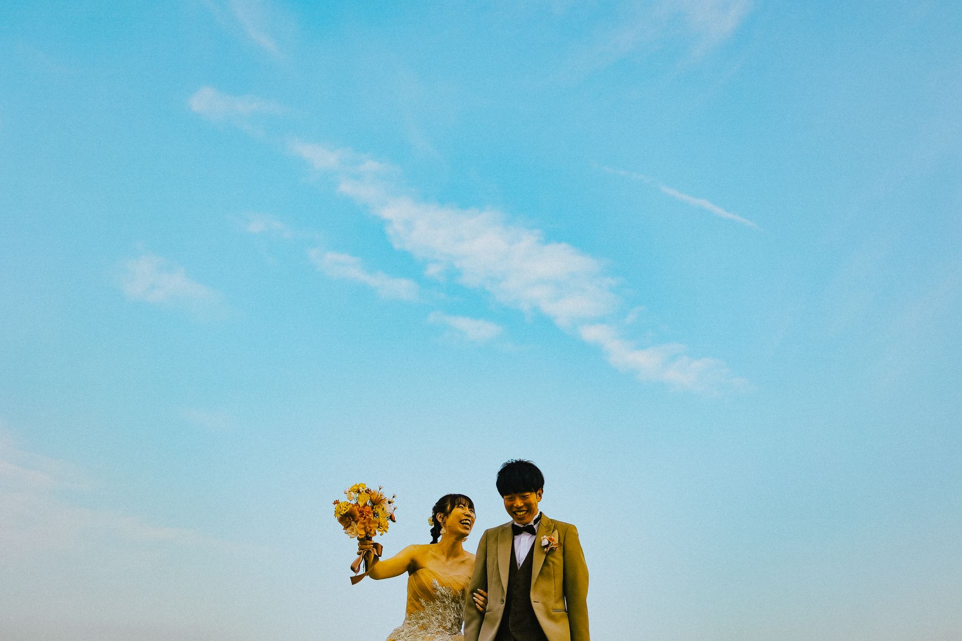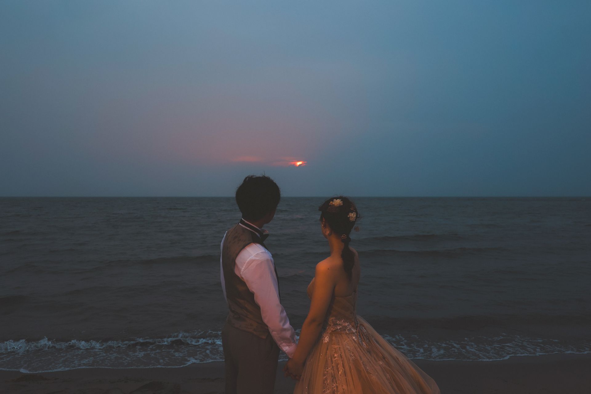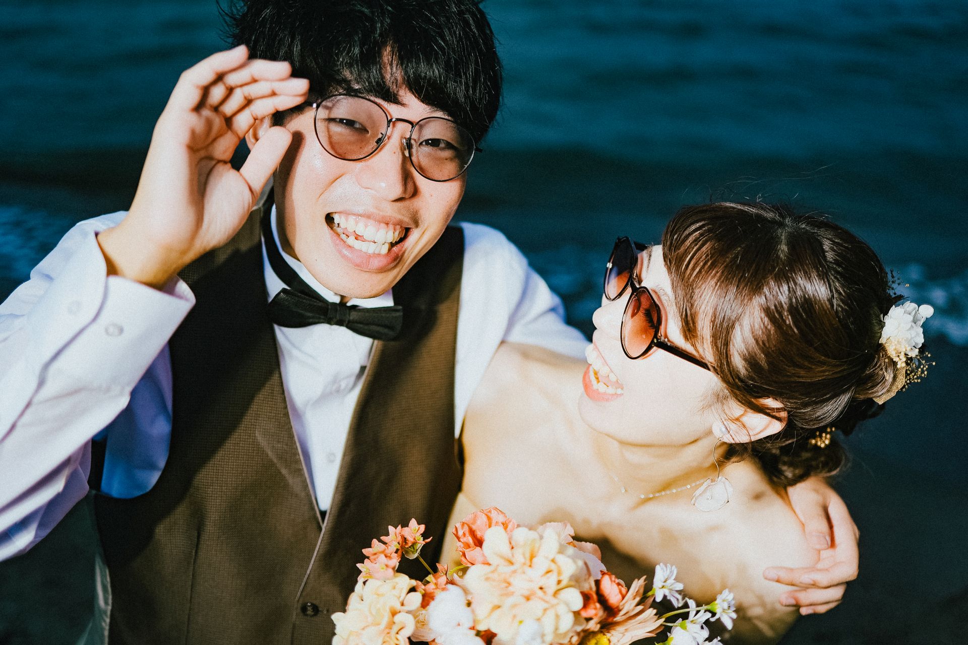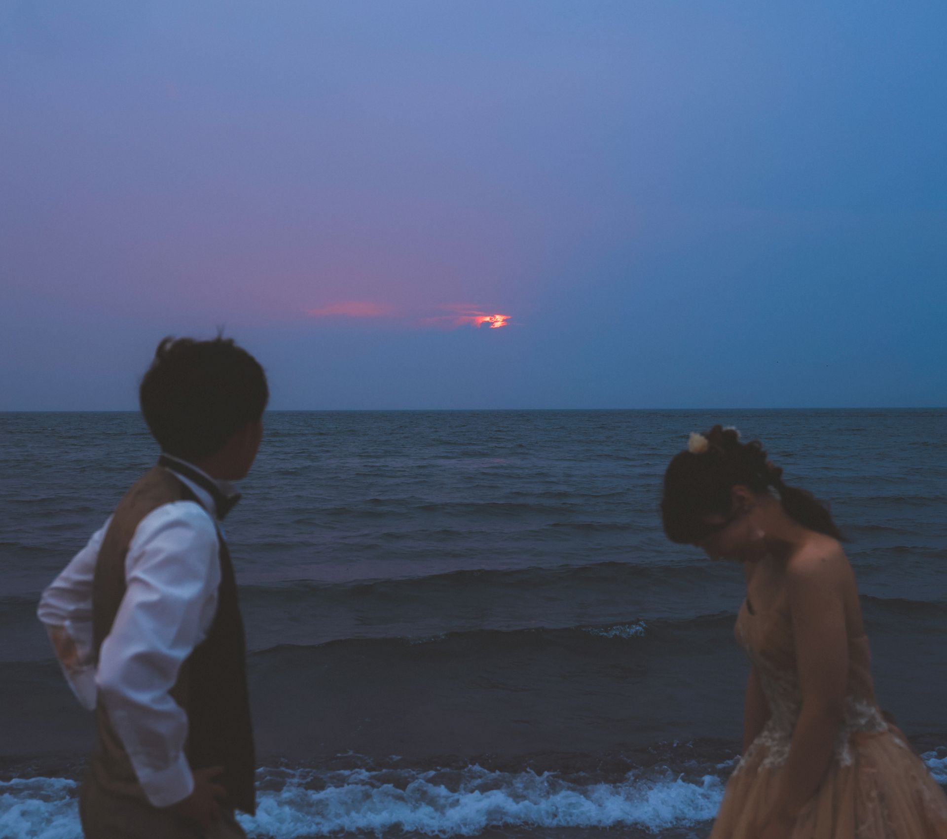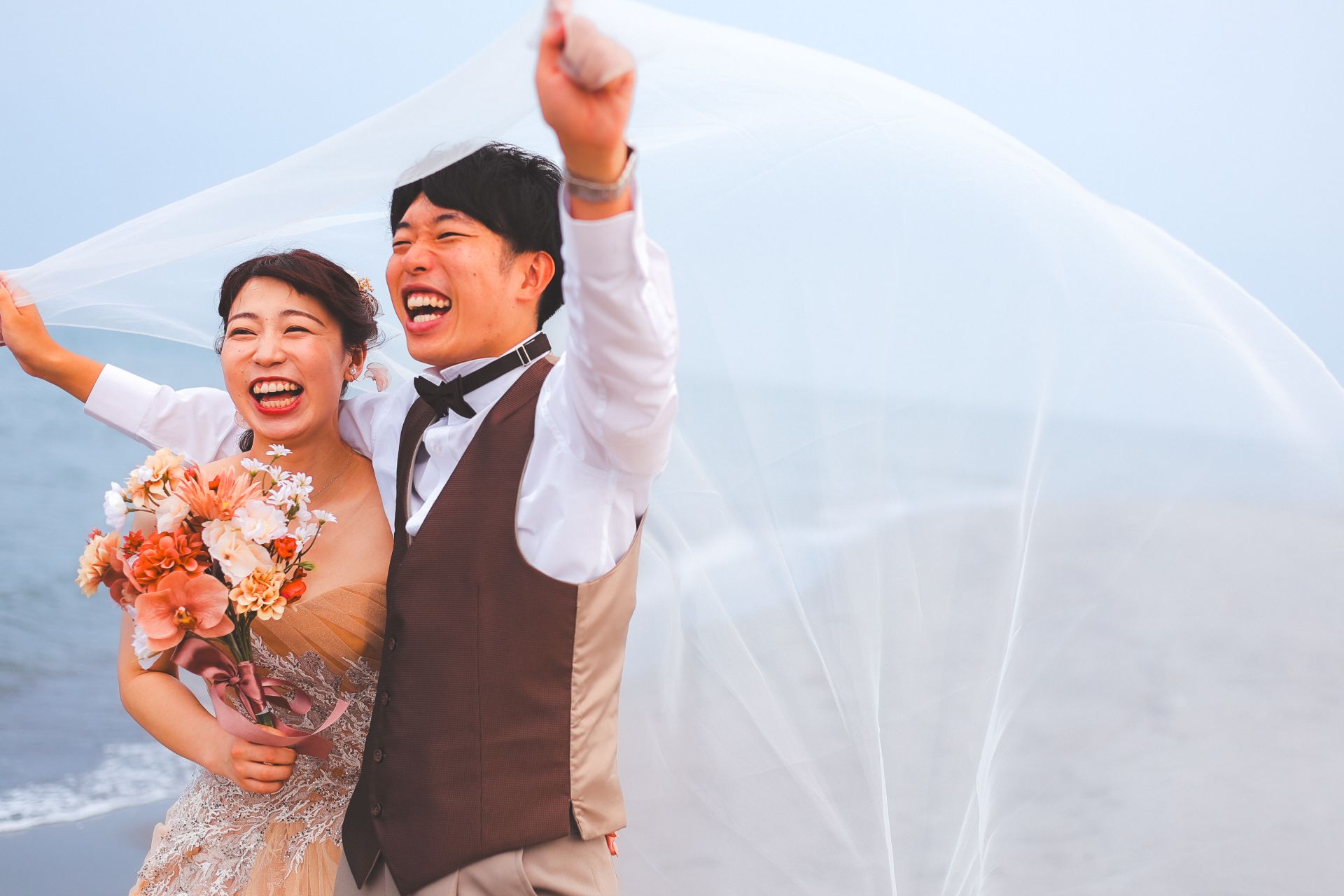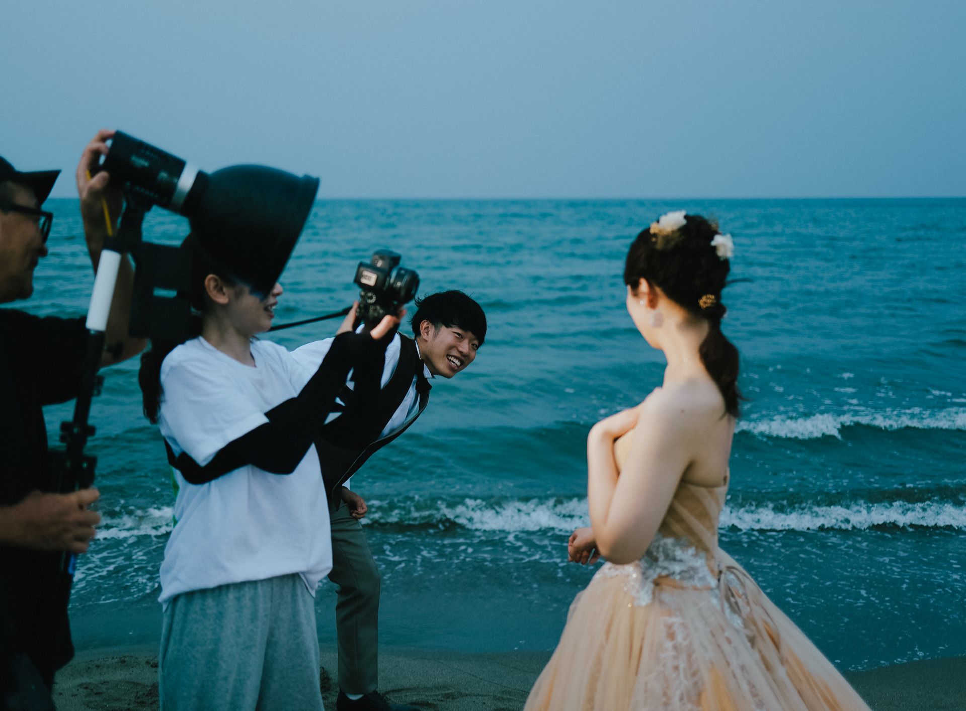 新潟の海辺、夕陽に包まれて 前撮りドレス ロケーションフォトドレス新潟ロケ海ロケ前撮りカラードレス 新潟の海辺、夕陽に包まれて 新潟の美しい海辺。夕暮れ時の柔らかな光が海と空を染め、まさに絶景の中での撮影となりました。 お二人の笑顔がとても印象的で、自然な表情が写真に溢れています。特に、夕日の優しい光が二人の表情を引き立て、温かみのある素敵に仕上がりました。 海辺の風や波の音も心地よく、リラックスした雰囲気の中で前撮りでした。思い出に残る、最高のひとときとなりました。