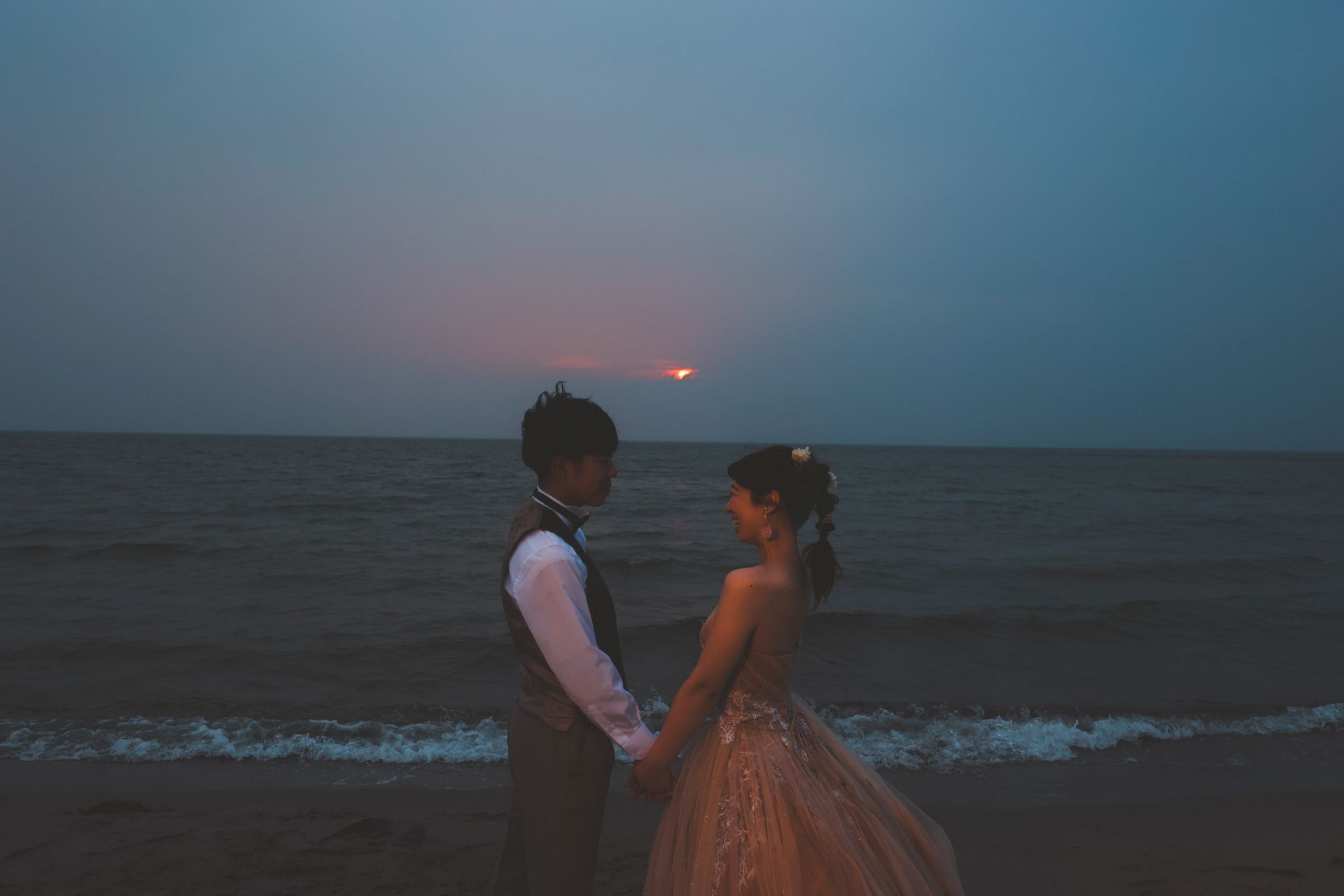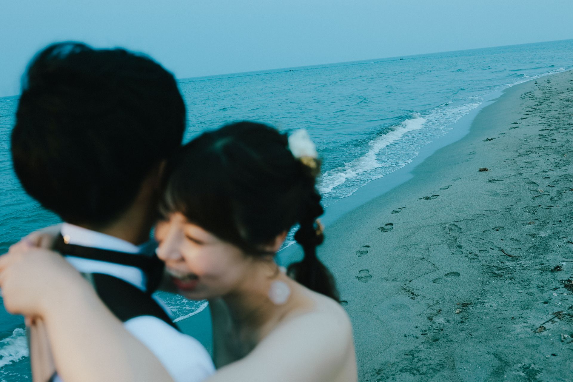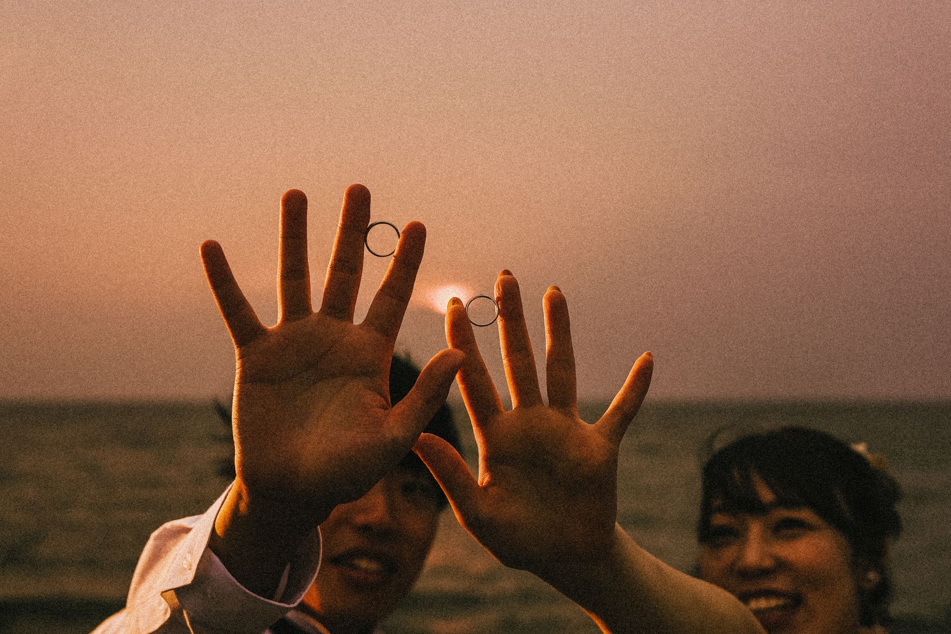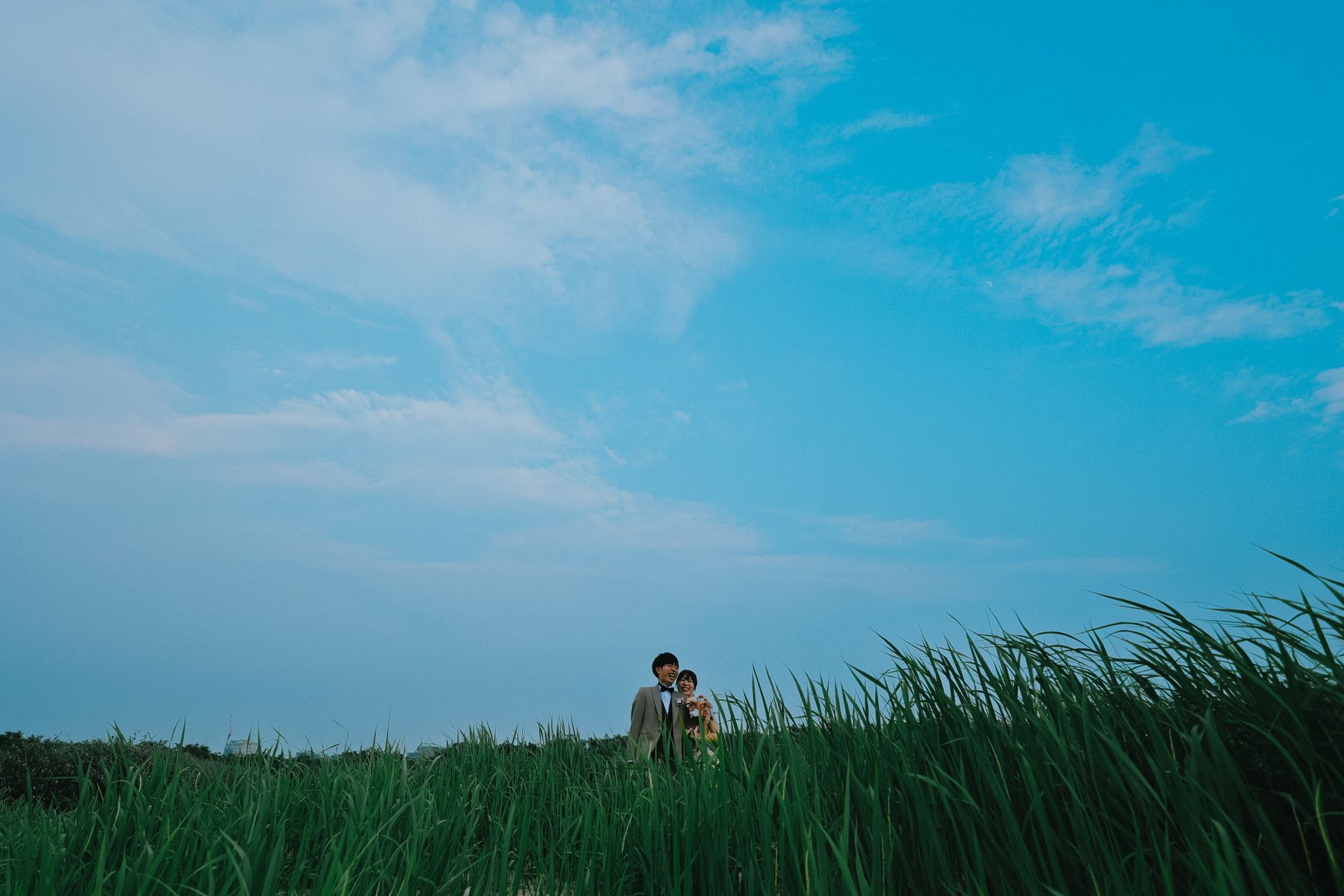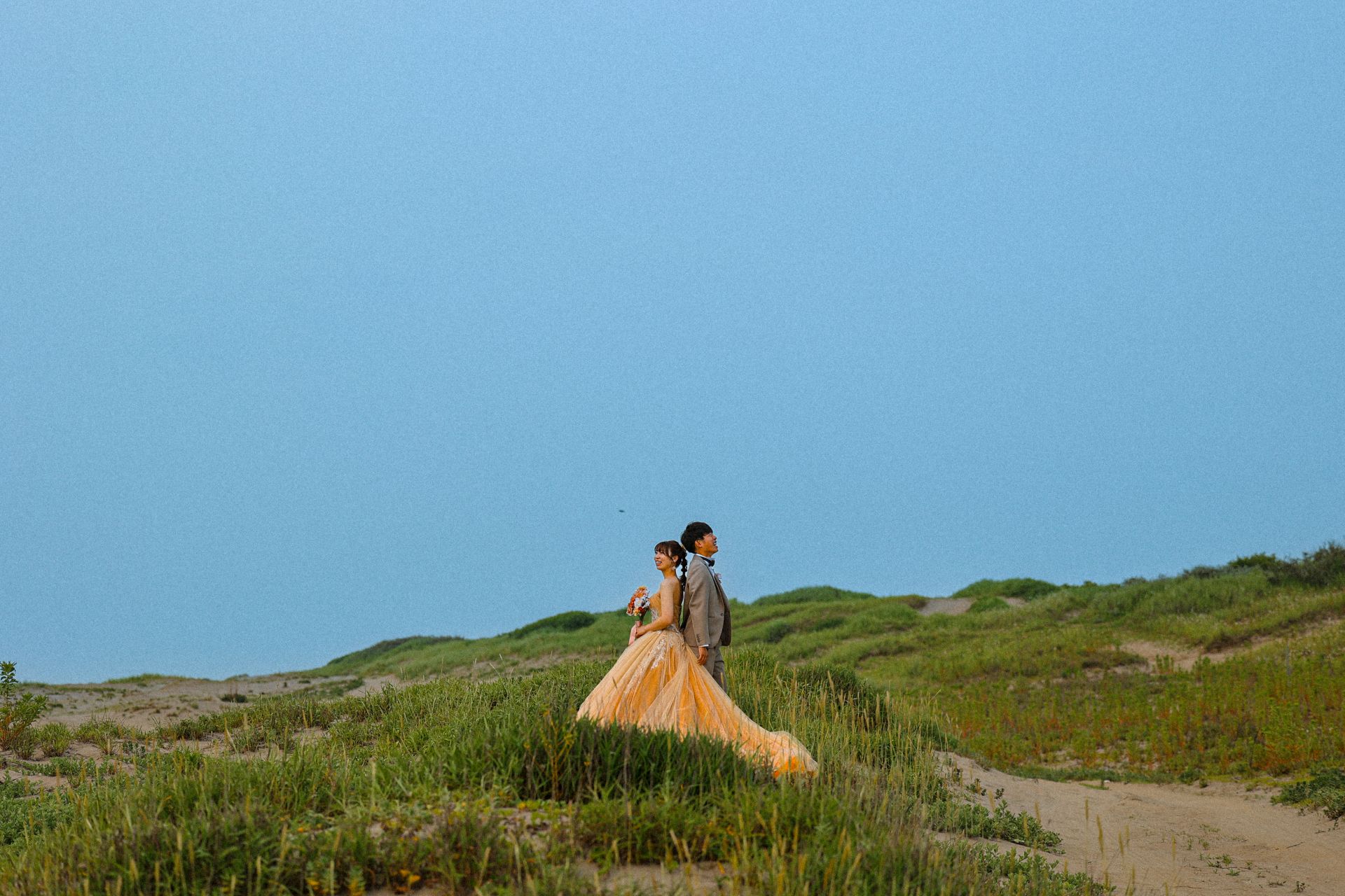 新潟の海辺、夕陽に包まれて 前撮りドレス ロケーションフォトドレス新潟ロケ海ロケ前撮りカラードレス 新潟の海辺、夕陽に包まれて 新潟の美しい海辺。夕暮れ時の柔らかな光が海と空を染め、まさに絶景の中での撮影となりました。 お二人の笑顔がとても印象的で、自然な表情が写真に溢れています。特に、夕日の優しい光が二人の表情を引き立て、温かみのある素敵に仕上がりました。 海辺の風や波の音も心地よく、リラックスした雰囲気の中で前撮りでした。思い出に残る、最高のひとときとなりました。