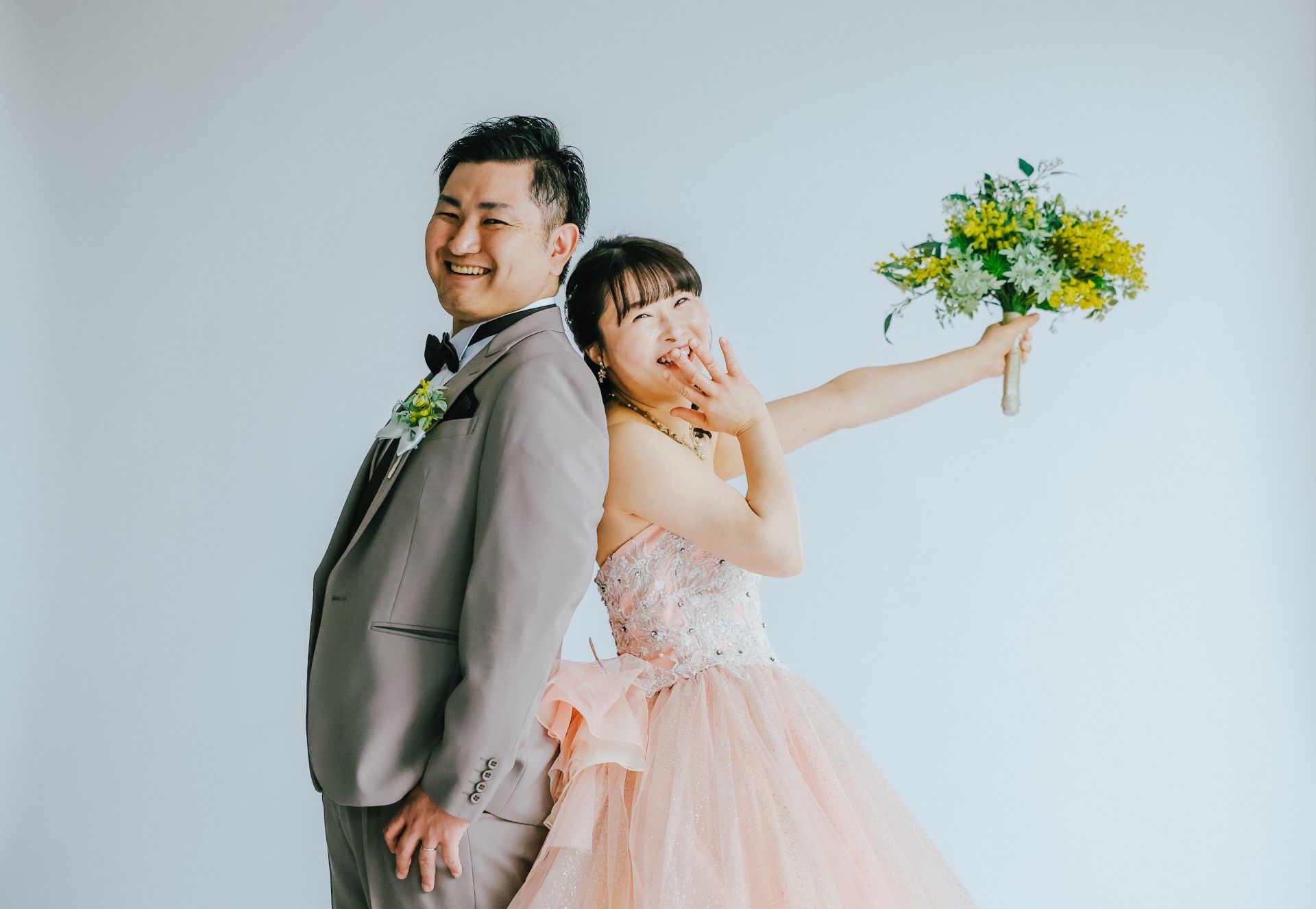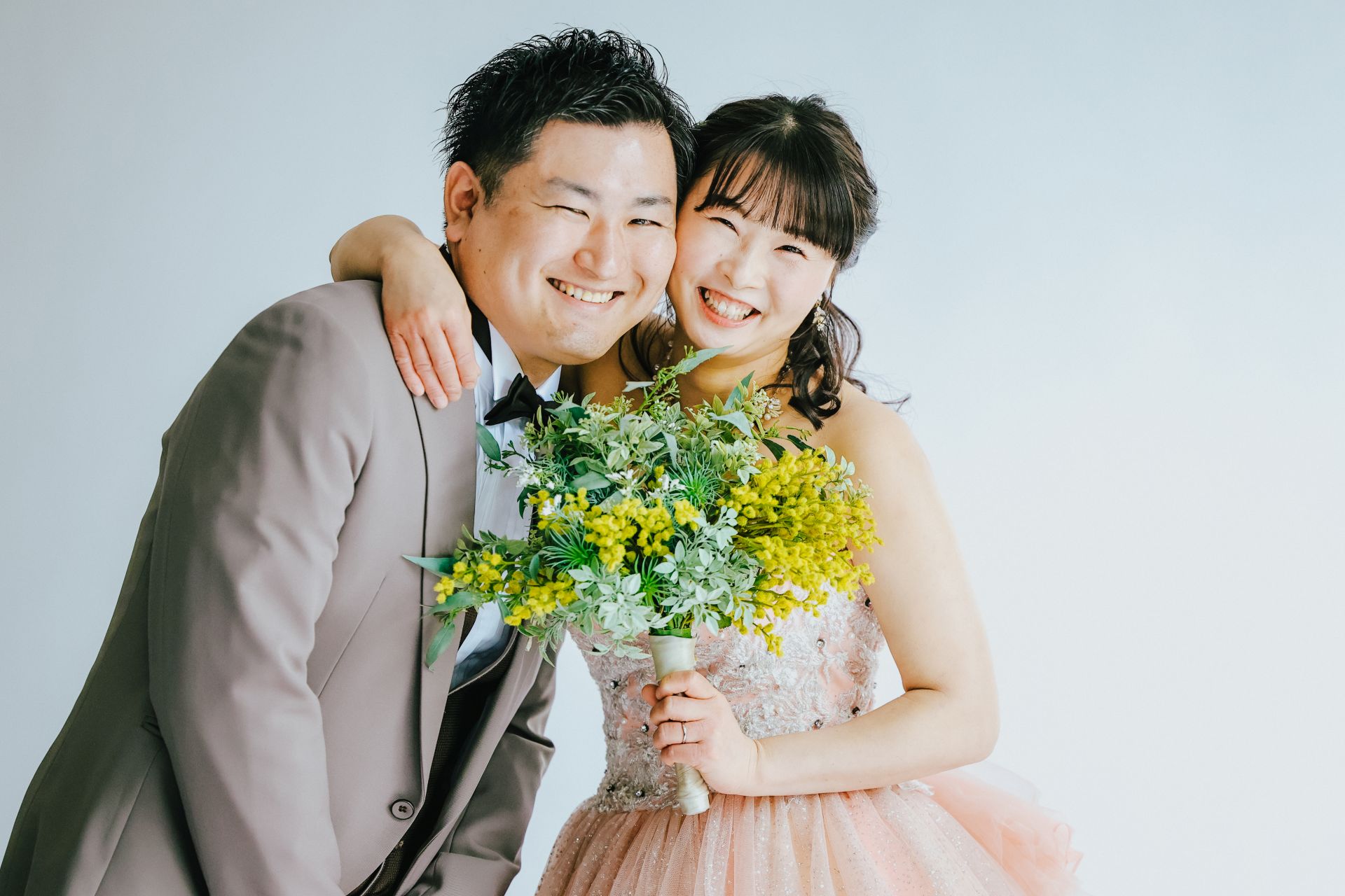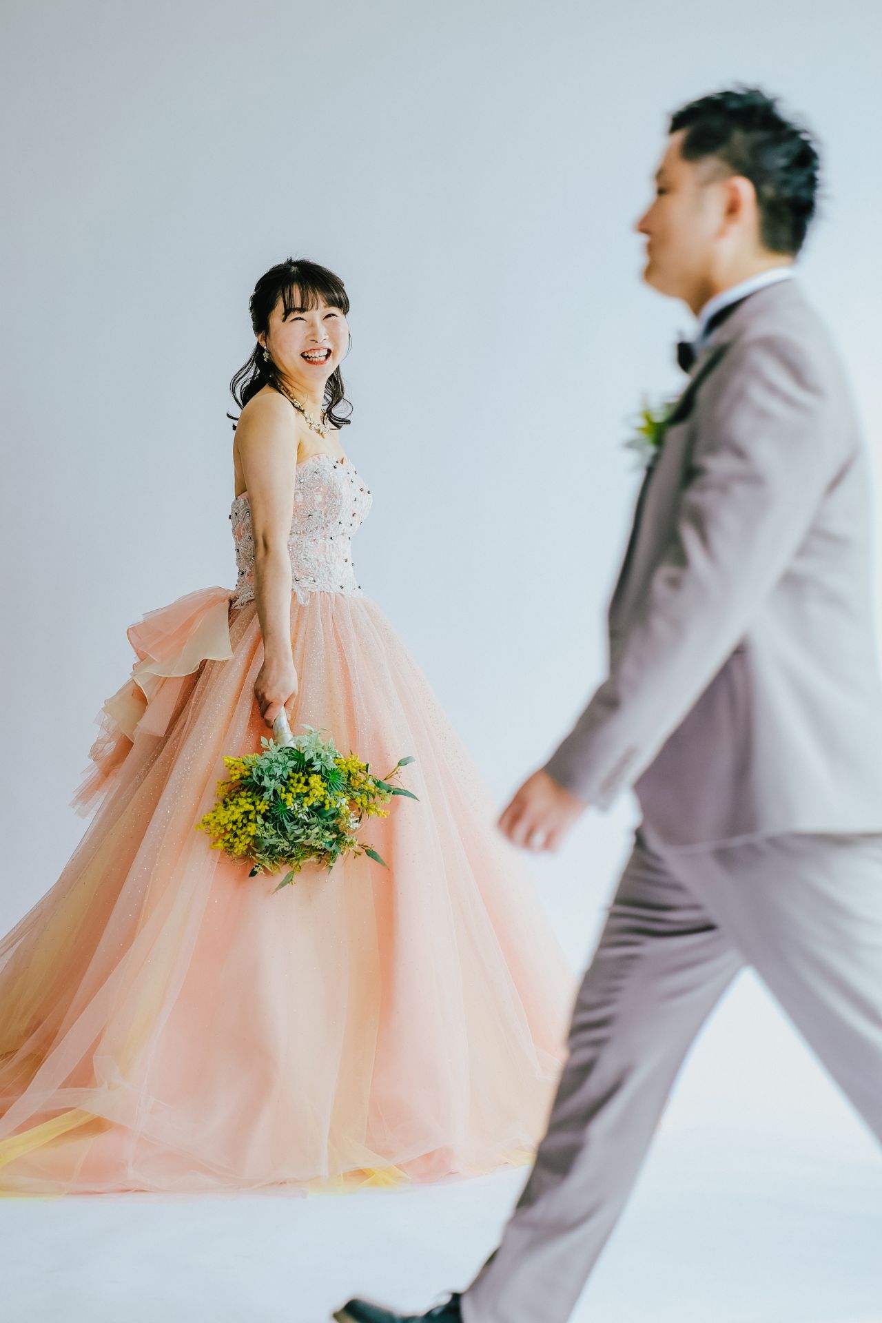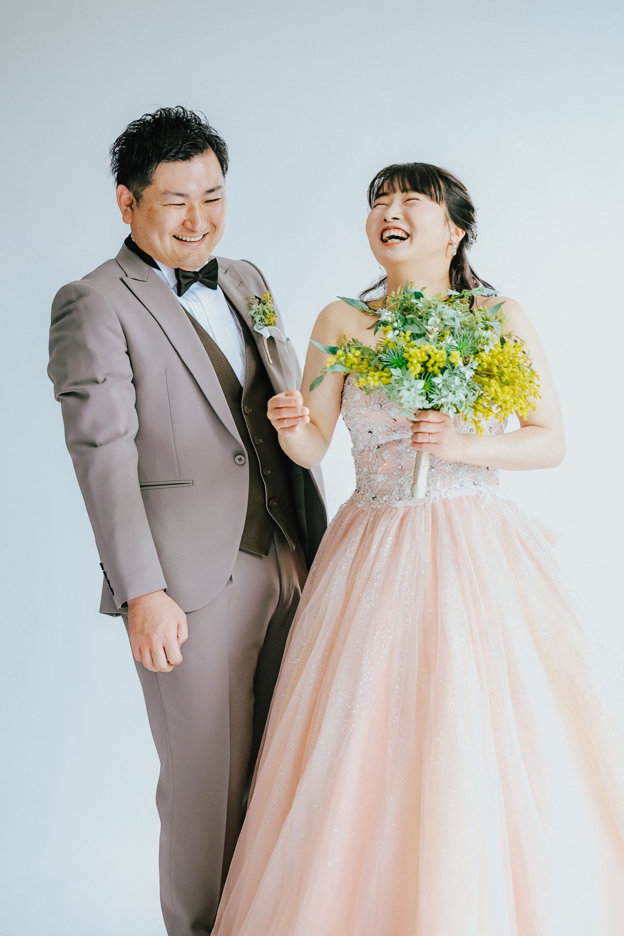 「笑顔ってみんなを幸せにさせるマジック」 前撮りフォトウェディング 前撮りカラードレス 「笑顔ってみんなを幸せにさせるマジック」 カメラを向けると自然と出てくる、やわらかないつもの笑顔。今回はおふたりのお気に入りの愛着のあるアイテムも登場し、より“ふたりらしい”撮影に。笑顔ってみんなを幸せにさせるマジックだとあらためて感じました。