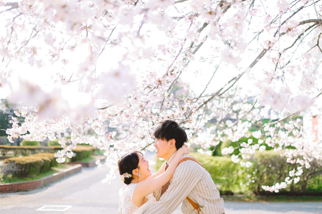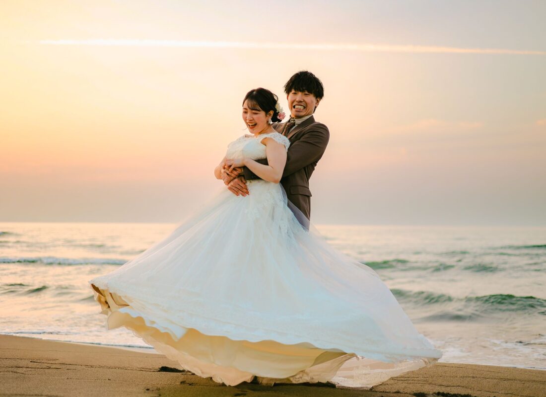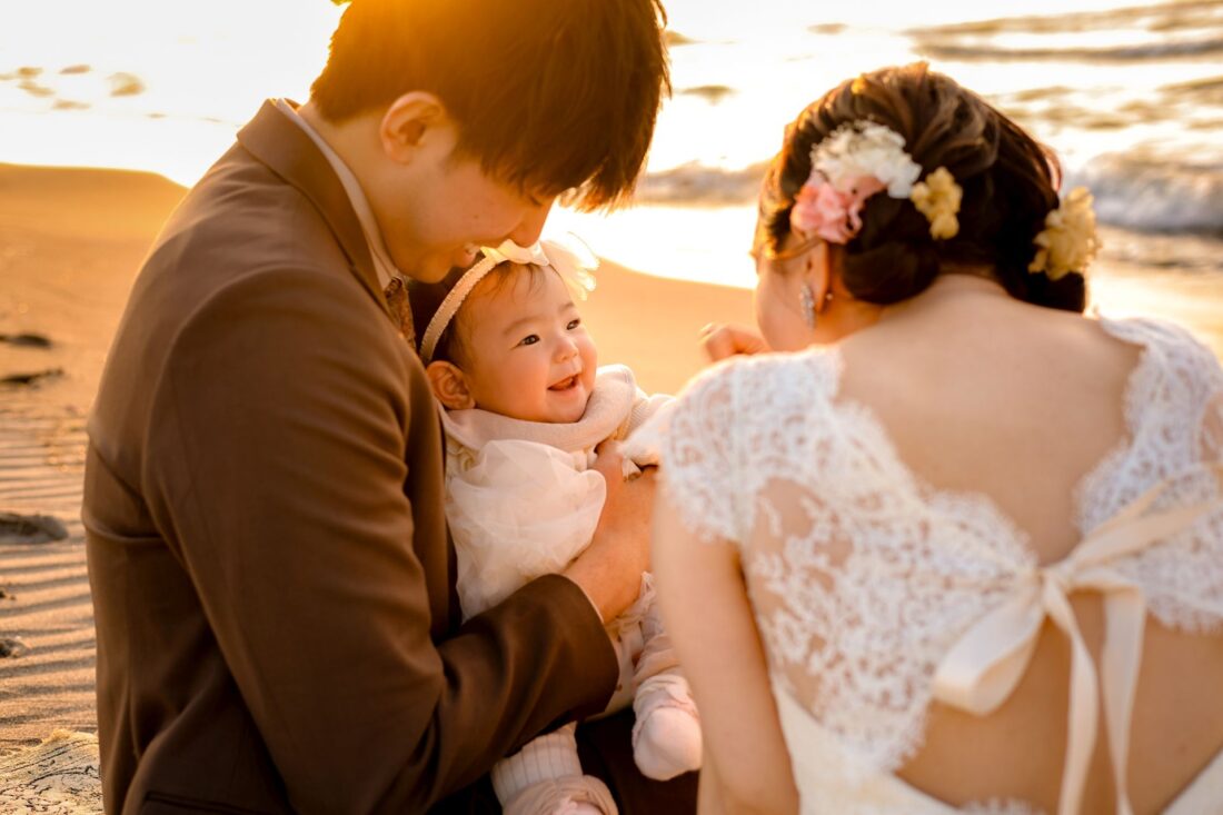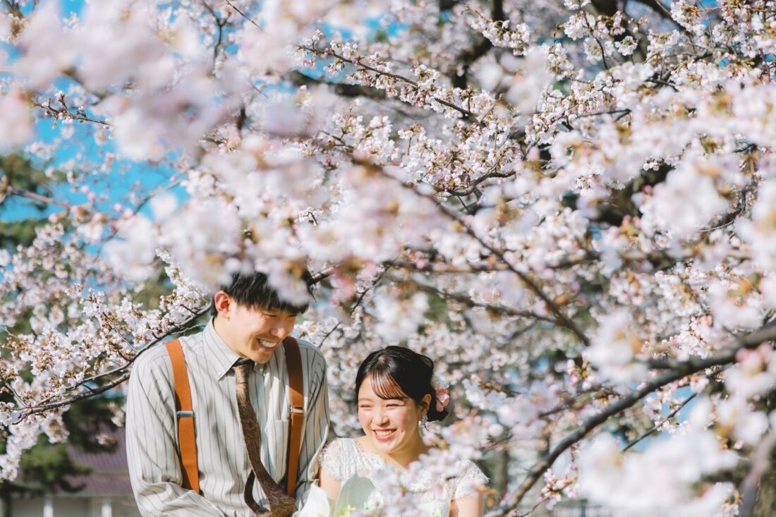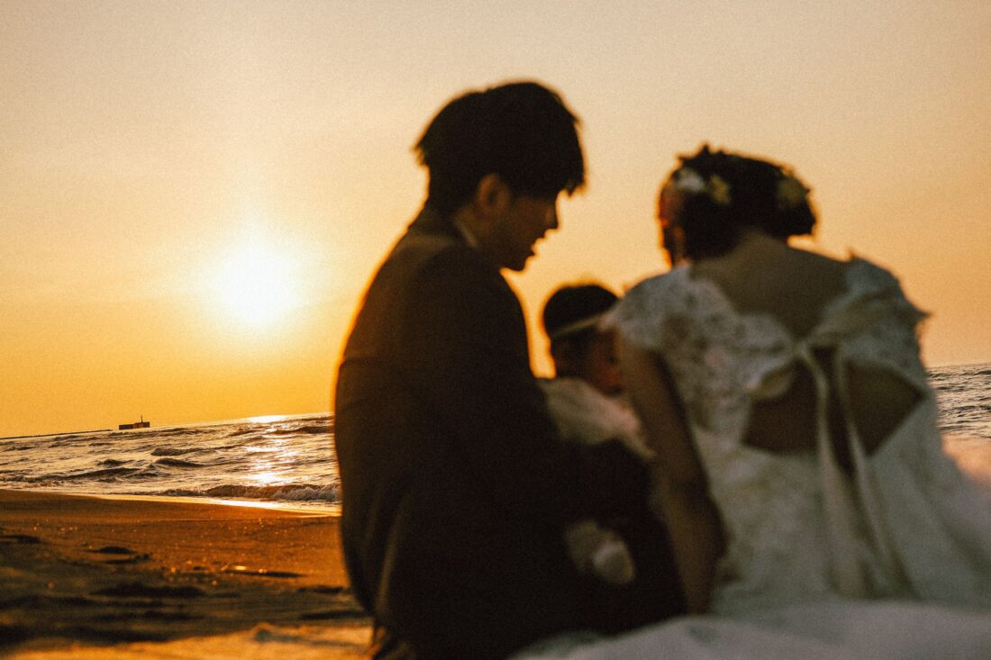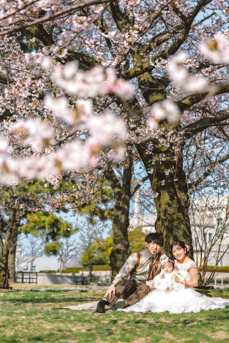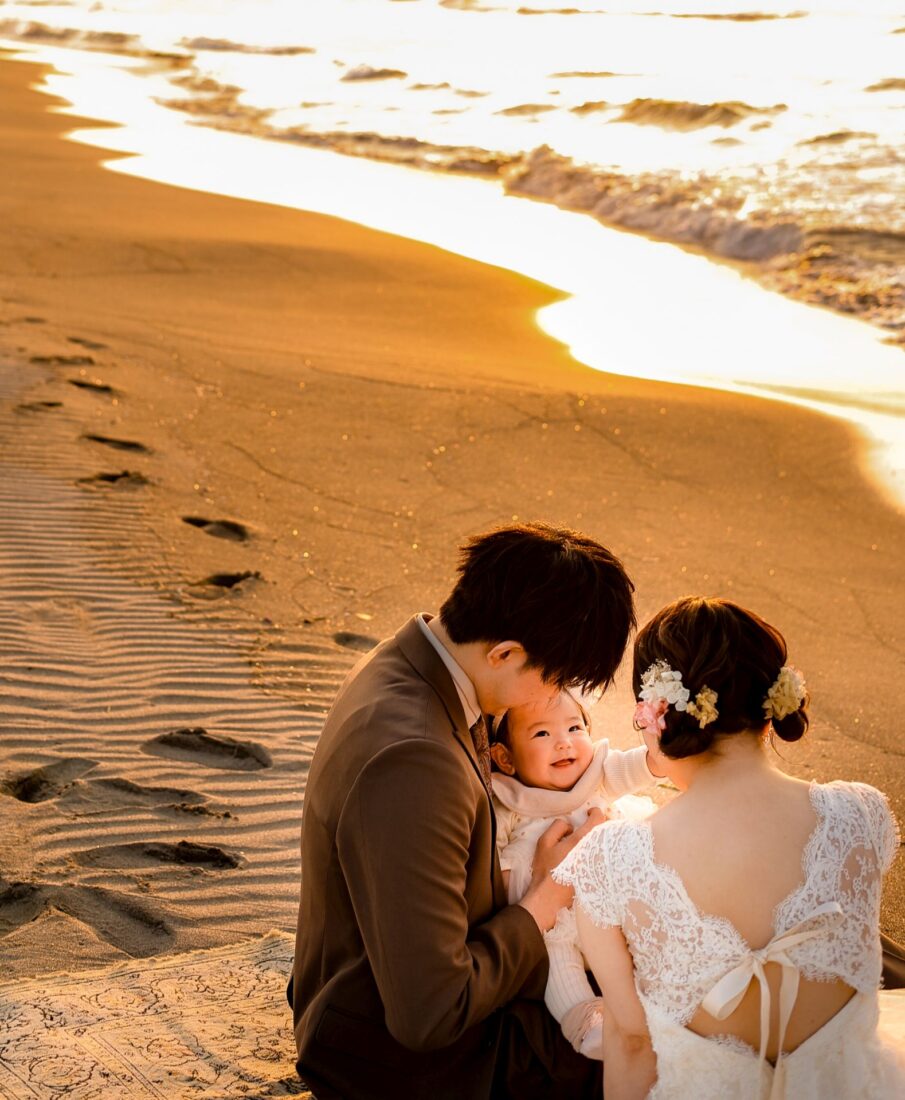 「桜と夕日に包まれた一日」 前撮りドレスフォトウェディング ウェディングドレスロケーションフォトドレス新潟ロケ海ロケ前撮りパパママ婚 一年越しの念願だった新潟でのロケーション撮影時を重ねる中でご家族も増え、あの頃よりも一層あたたかな空気に包まれたおふたり心配していた雨もこの日は澄み渡るような晴天に恵まれました桜も撮影日に合わせて開花そして一日の締めくくりには真っ赤に染まる夕日家族と季節の『今』を残す撮影となりました