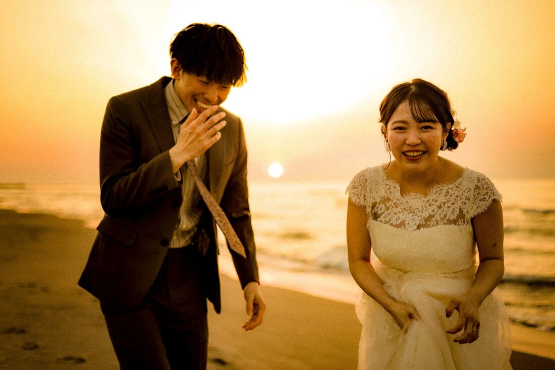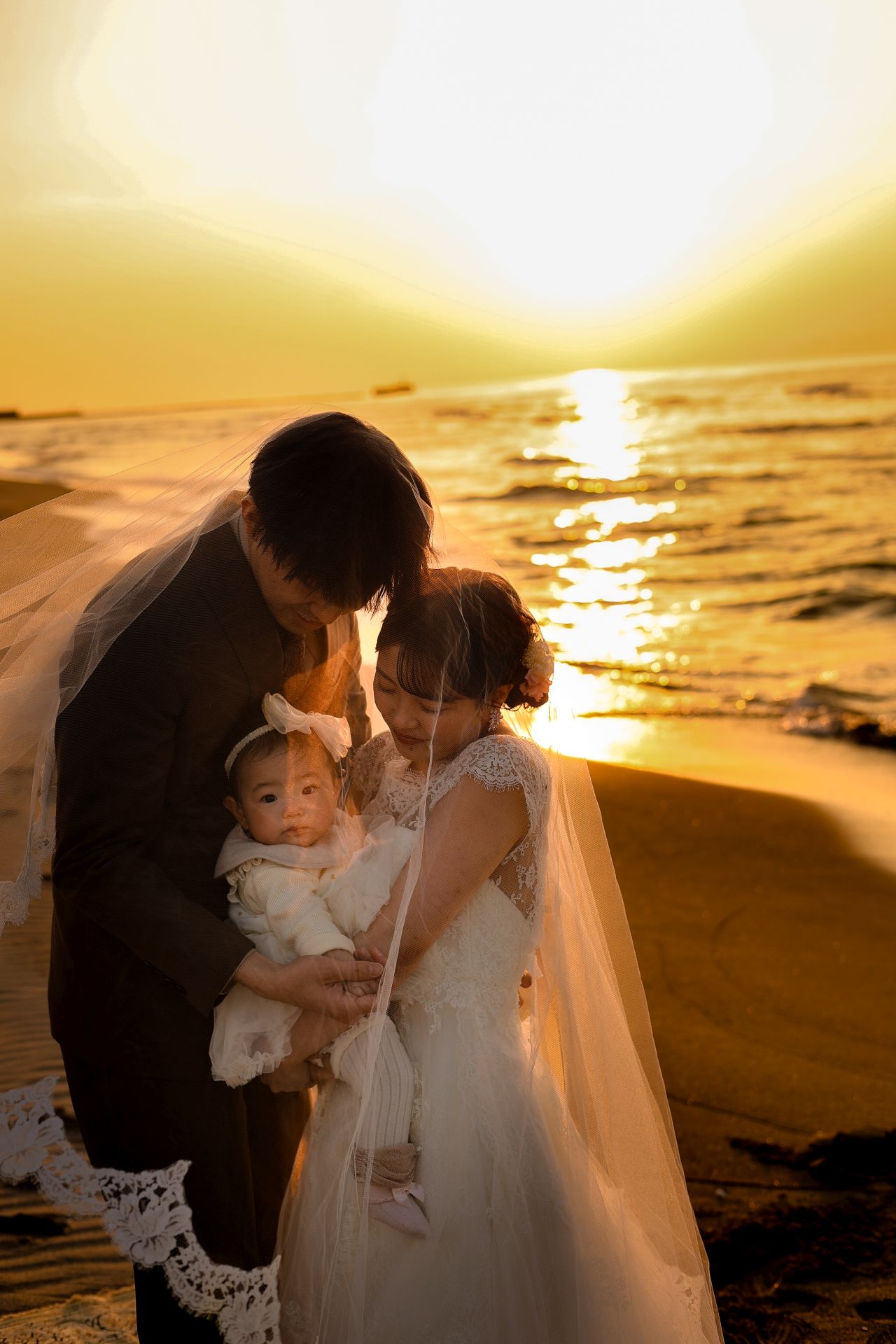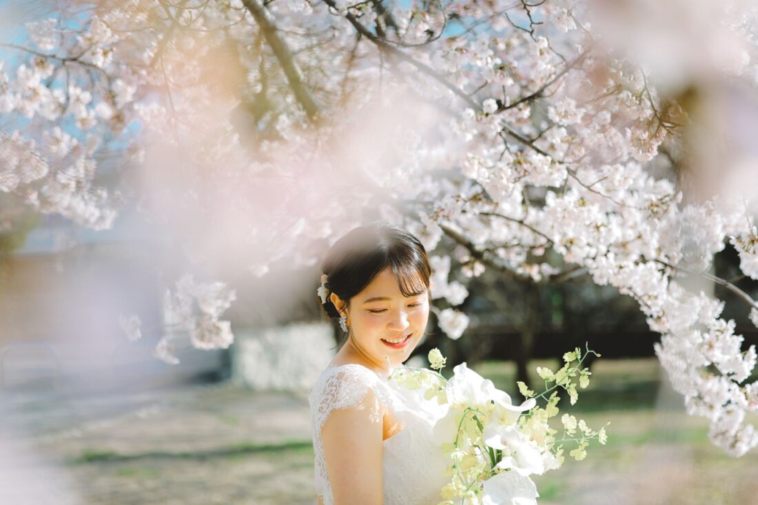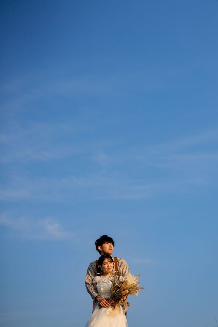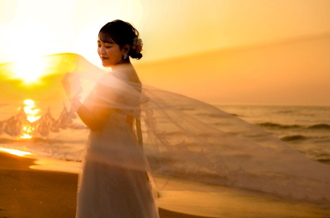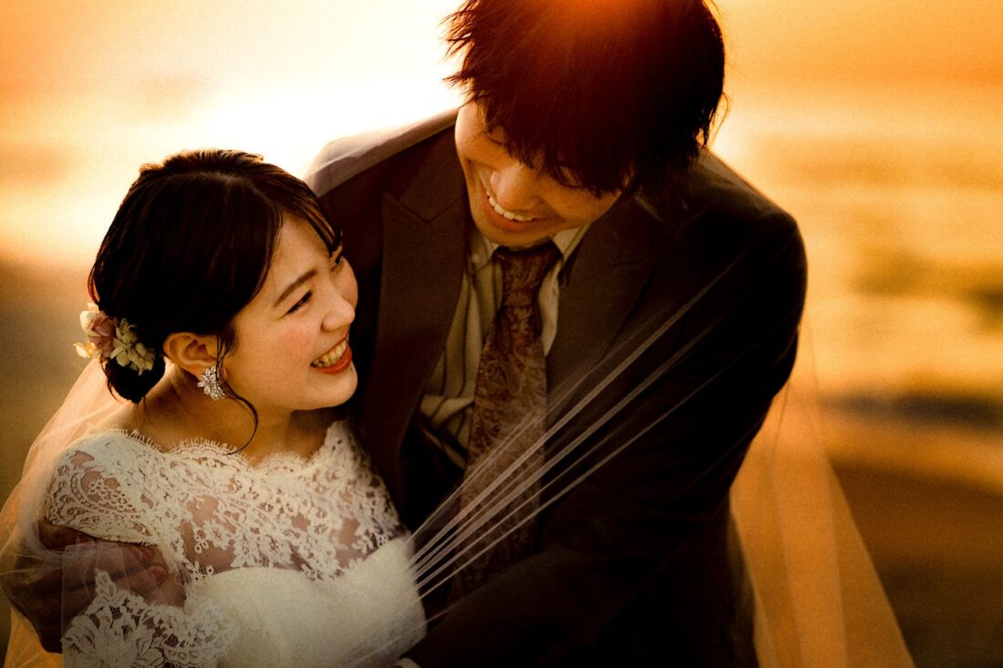 「桜と夕日に包まれた一日」 前撮りドレスフォトウェディング ウェディングドレスロケーションフォトドレス新潟ロケ海ロケ前撮りパパママ婚 一年越しの念願だった新潟でのロケーション撮影時を重ねる中でご家族も増え、あの頃よりも一層あたたかな空気に包まれたおふたり心配していた雨もこの日は澄み渡るような晴天に恵まれました桜も撮影日に合わせて開花そして一日の締めくくりには真っ赤に染まる夕日家族と季節の『今』を残す撮影となりました