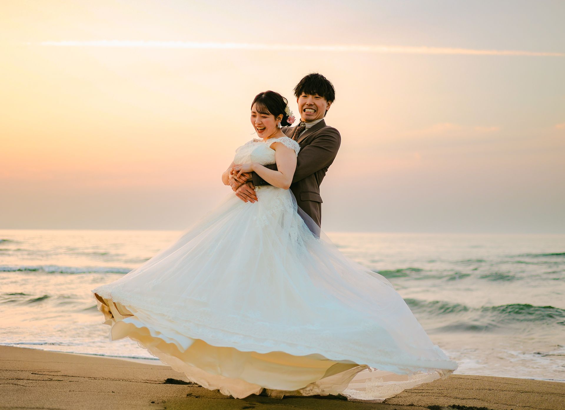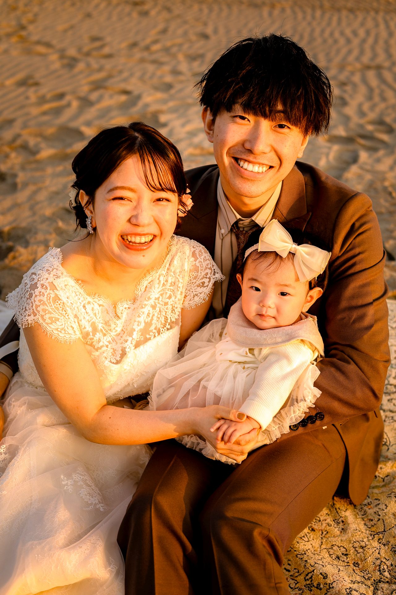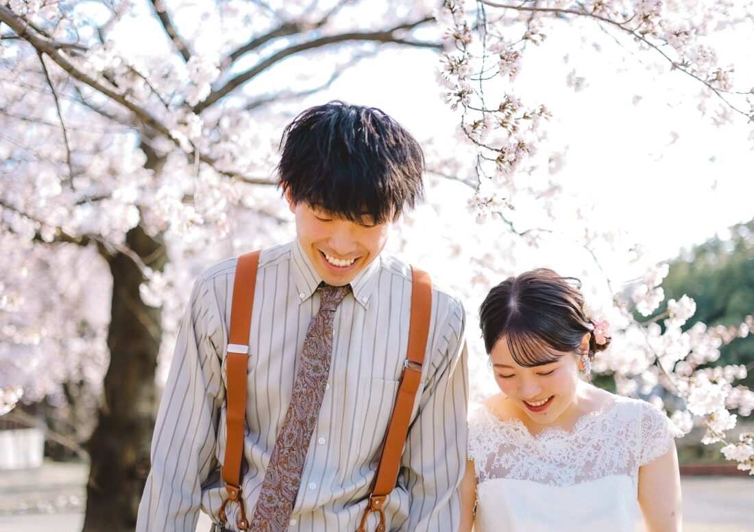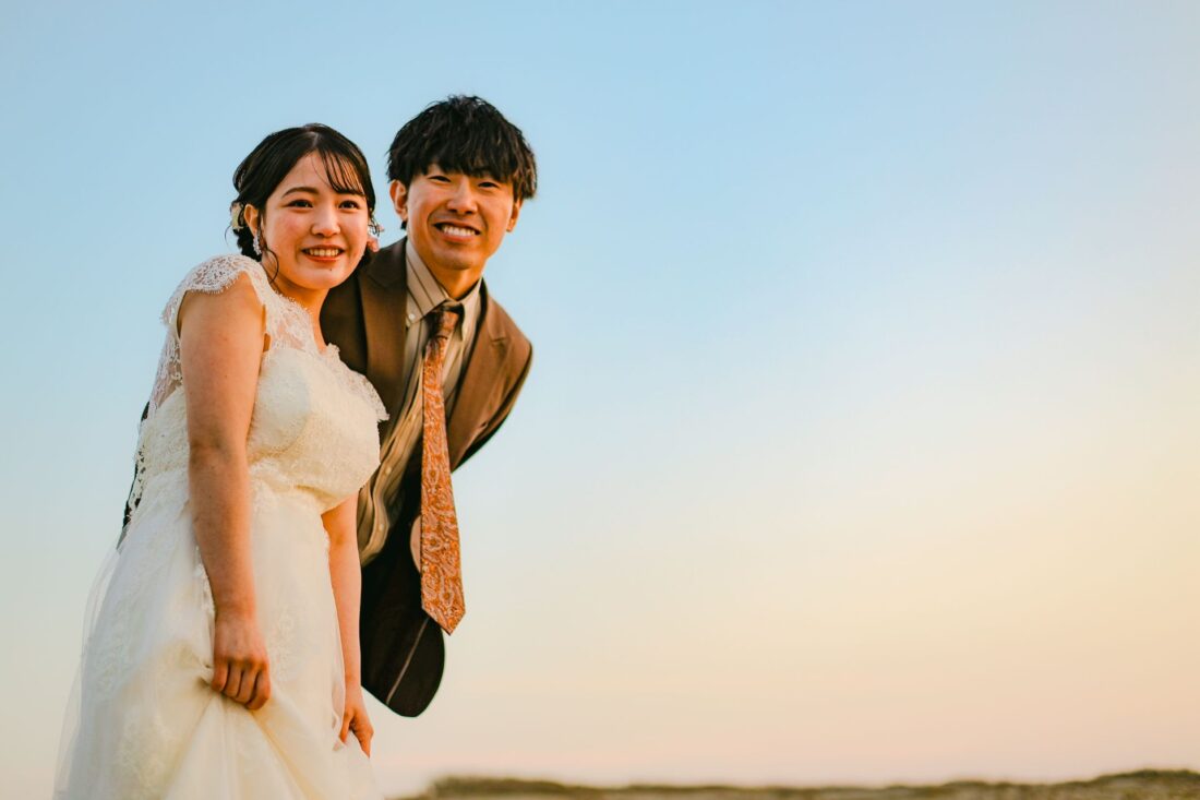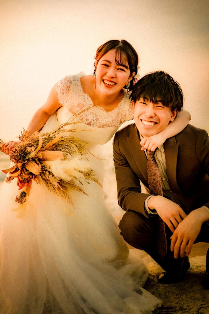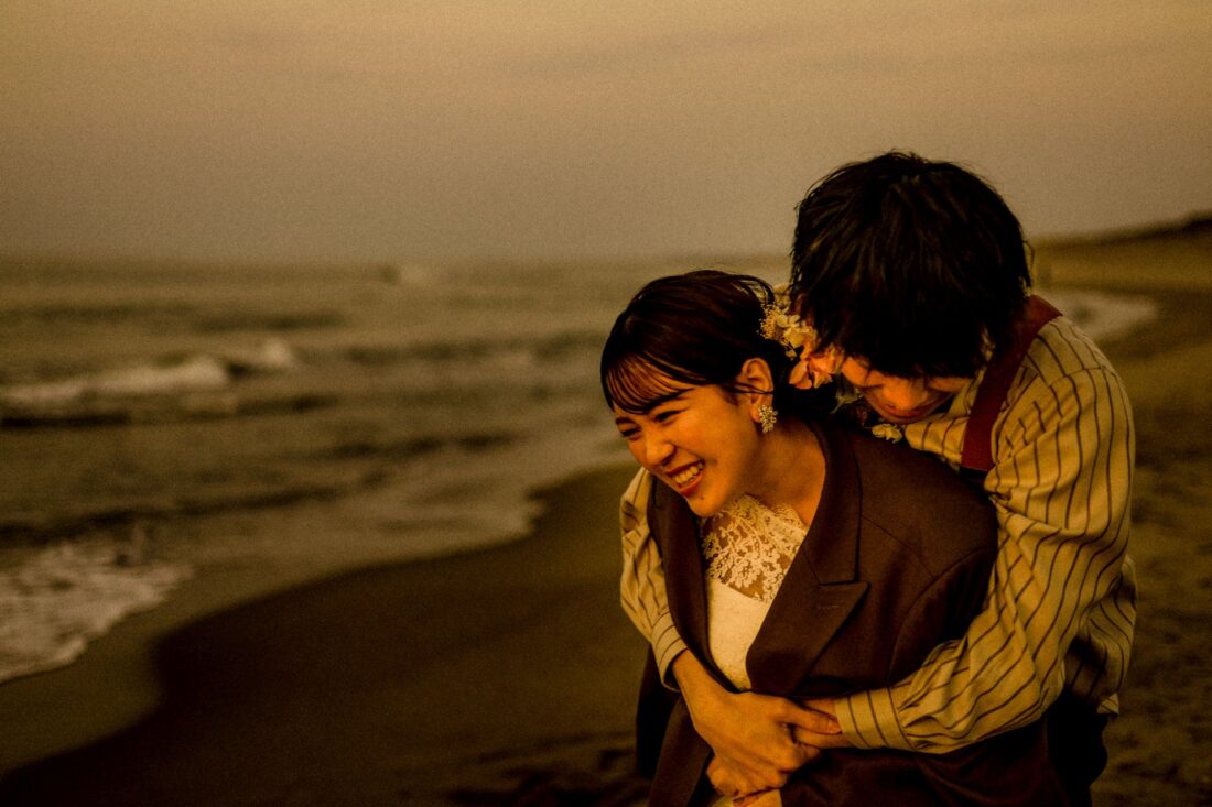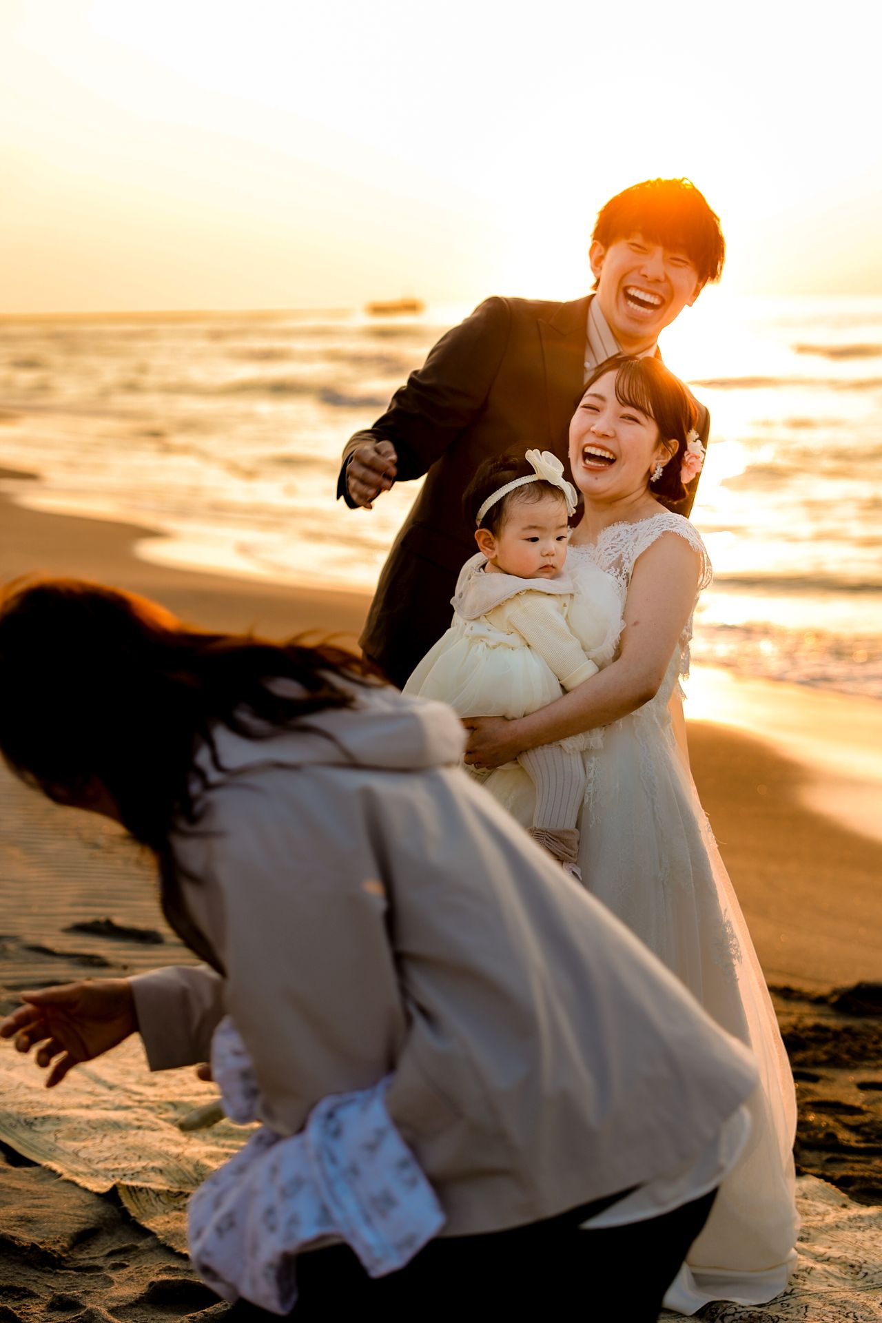 「桜と夕日に包まれた一日」 前撮りドレスフォトウェディング ウェディングドレスロケーションフォトドレス新潟ロケ海ロケ前撮りパパママ婚 一年越しの念願だった新潟でのロケーション撮影時を重ねる中でご家族も増え、あの頃よりも一層あたたかな空気に包まれたおふたり心配していた雨もこの日は澄み渡るような晴天に恵まれました桜も撮影日に合わせて開花そして一日の締めくくりには真っ赤に染まる夕日家族と季節の『今』を残す撮影となりました