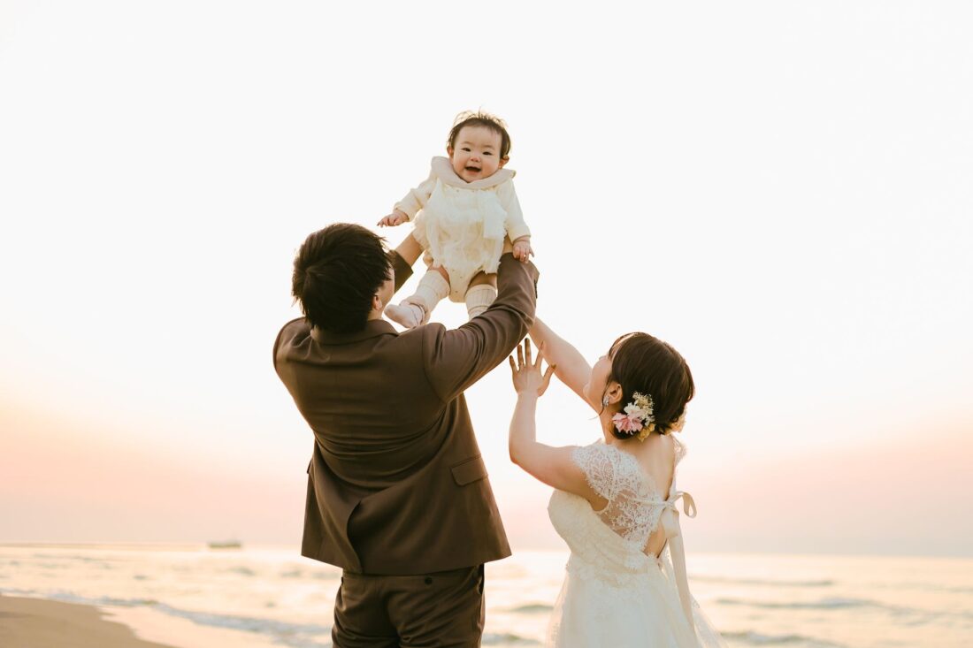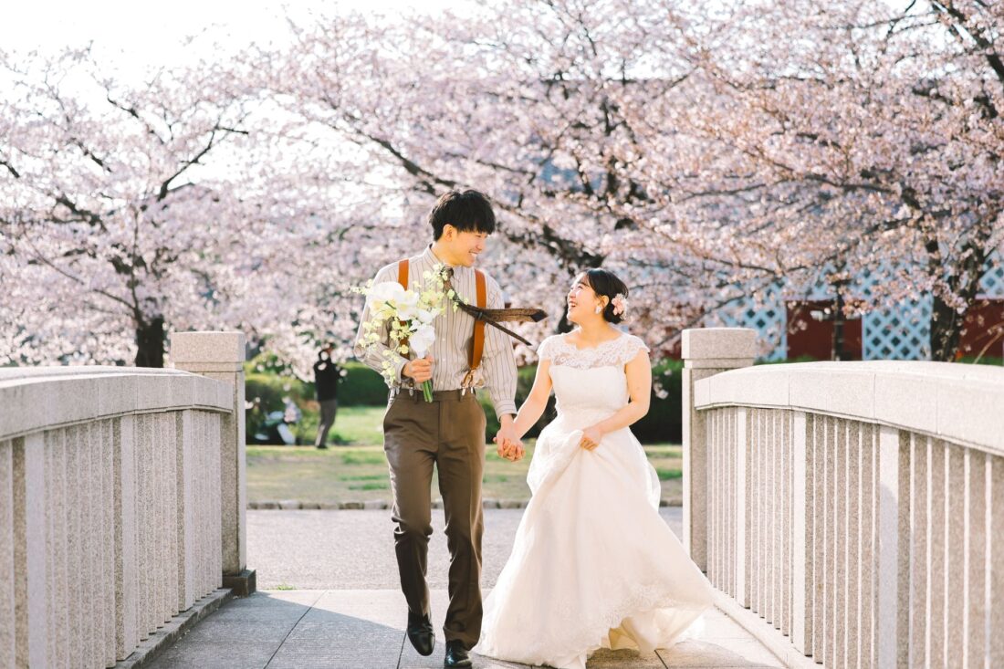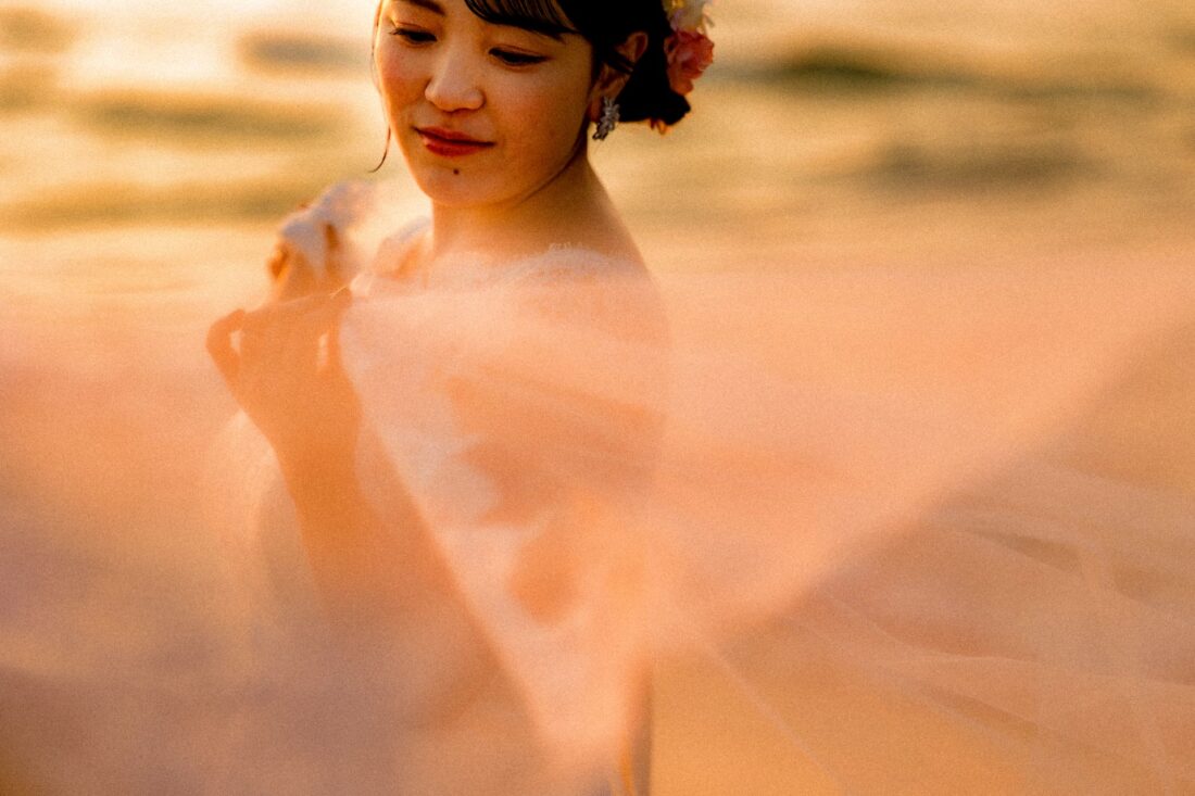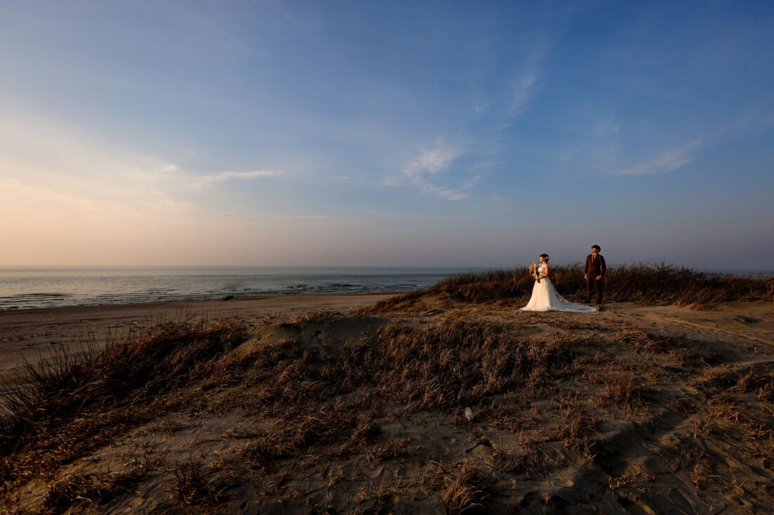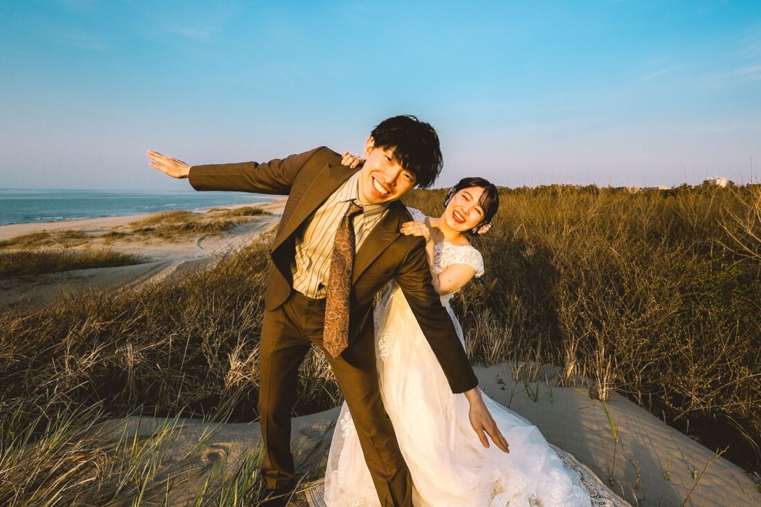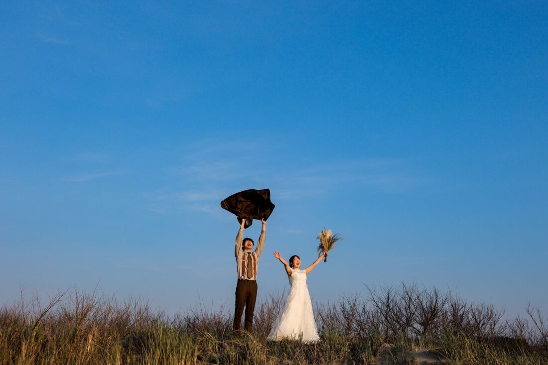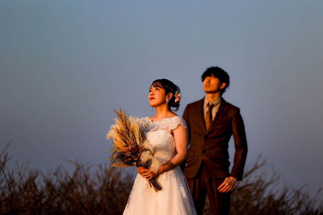 「桜と夕日に包まれた一日」 前撮りドレスフォトウェディング ウェディングドレスロケーションフォトドレス新潟ロケ海ロケ前撮りパパママ婚 一年越しの念願だった新潟でのロケーション撮影時を重ねる中でご家族も増え、あの頃よりも一層あたたかな空気に包まれたおふたり心配していた雨もこの日は澄み渡るような晴天に恵まれました桜も撮影日に合わせて開花そして一日の締めくくりには真っ赤に染まる夕日家族と季節の『今』を残す撮影となりました