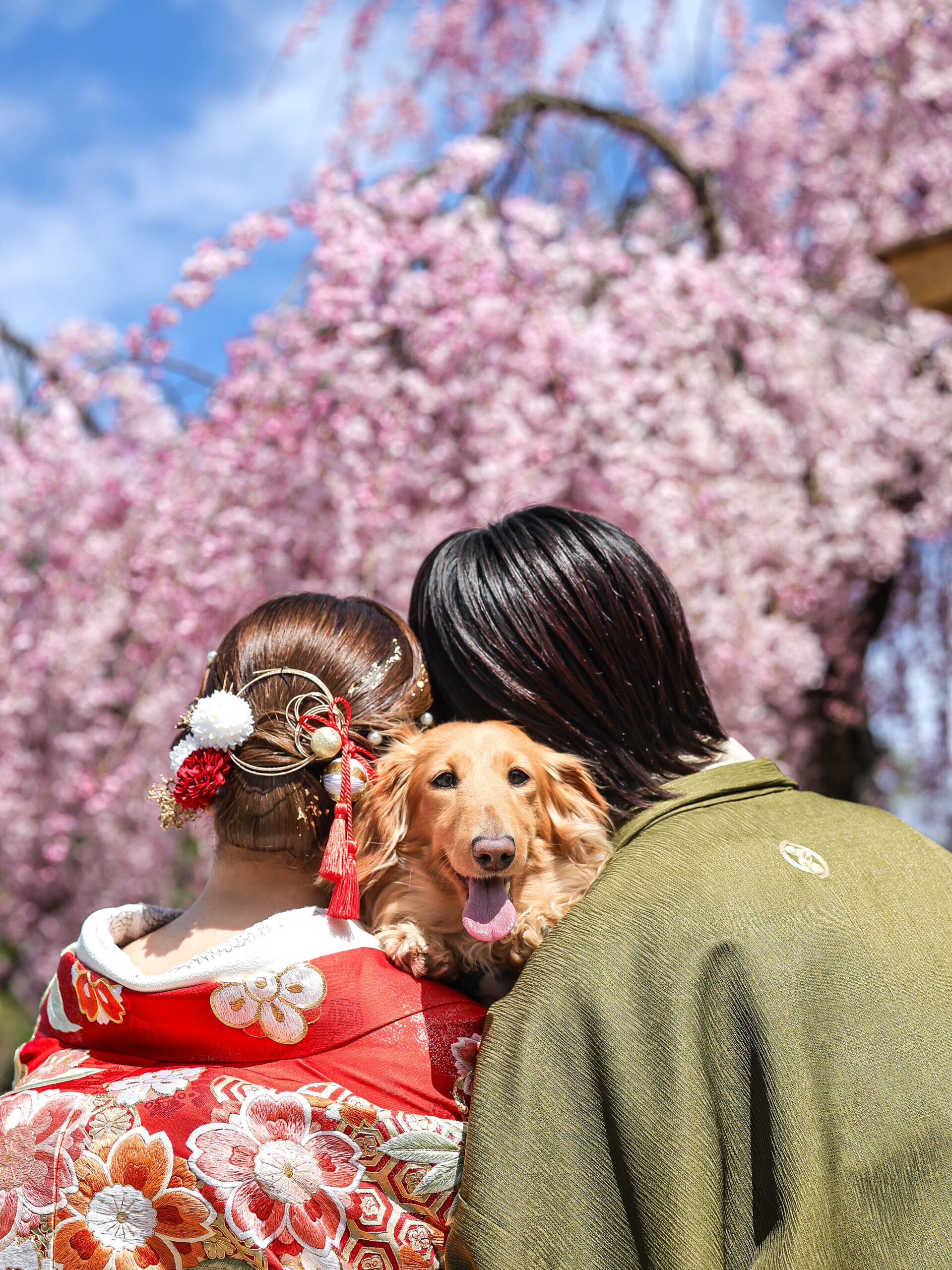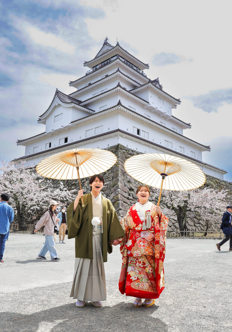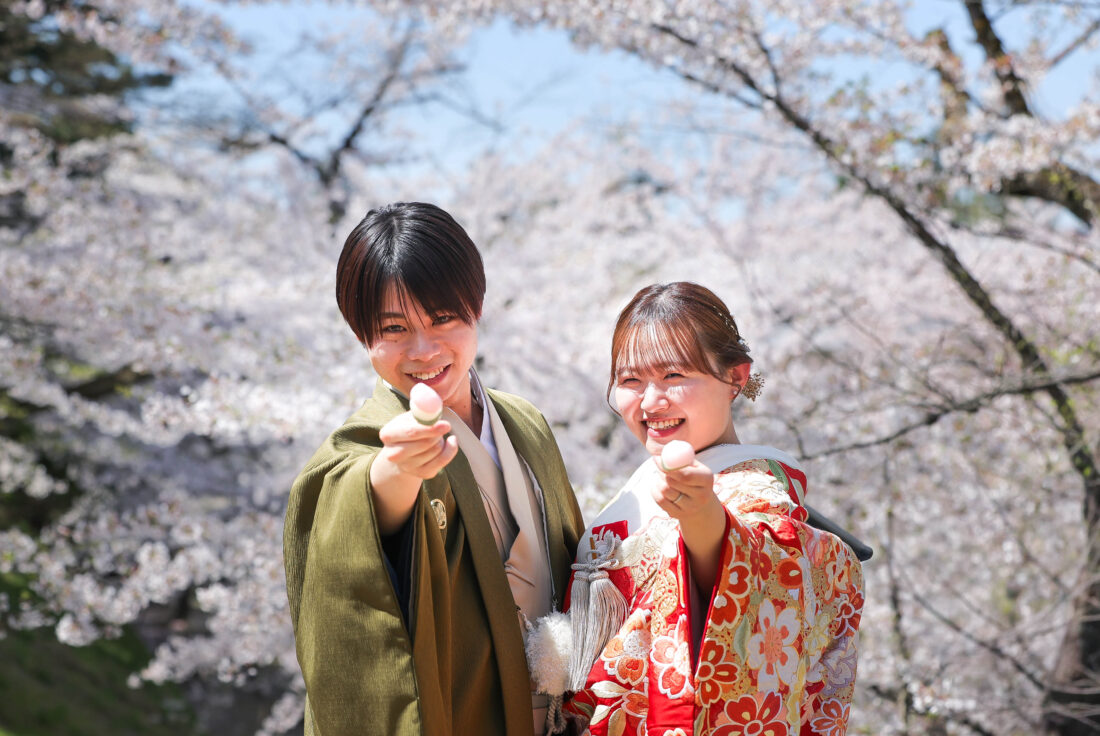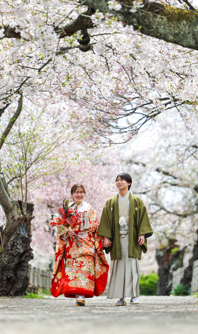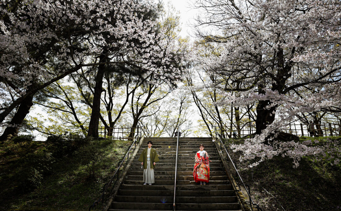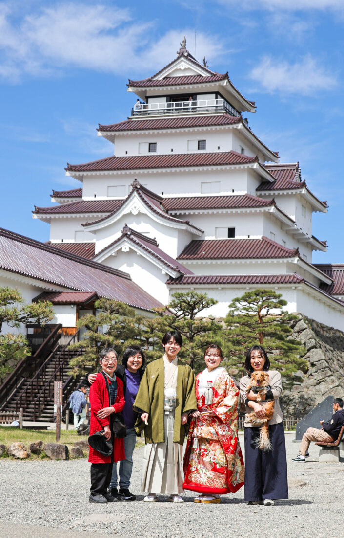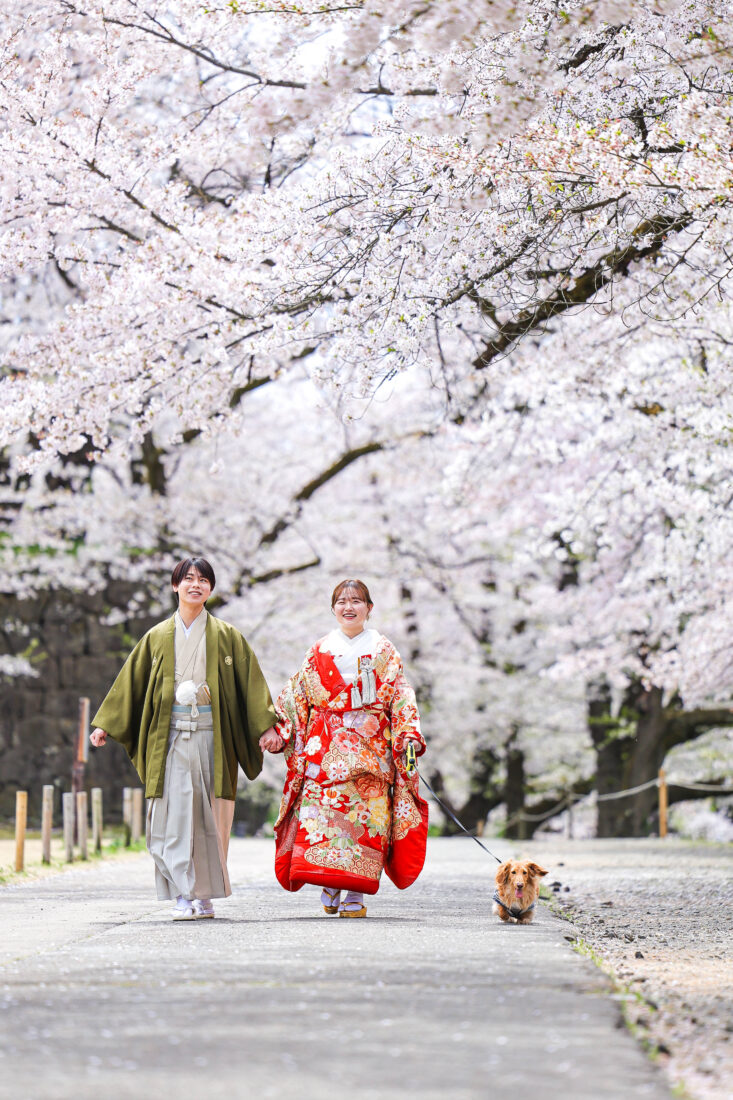 「駆け抜けた春!」 和装前撮りフォトウェディング ロケーションフォトドレス色打掛和装前撮りペットと一緒 来月の結婚式に先駆けての前撮り撮影心配していた桜もまだまだ見頃で『鶴ヶ城×桜』の夢が叶いましたお二人の可愛らしい笑顔と愛犬ロイくんの元気な走りっぷりに私たちも癒されました