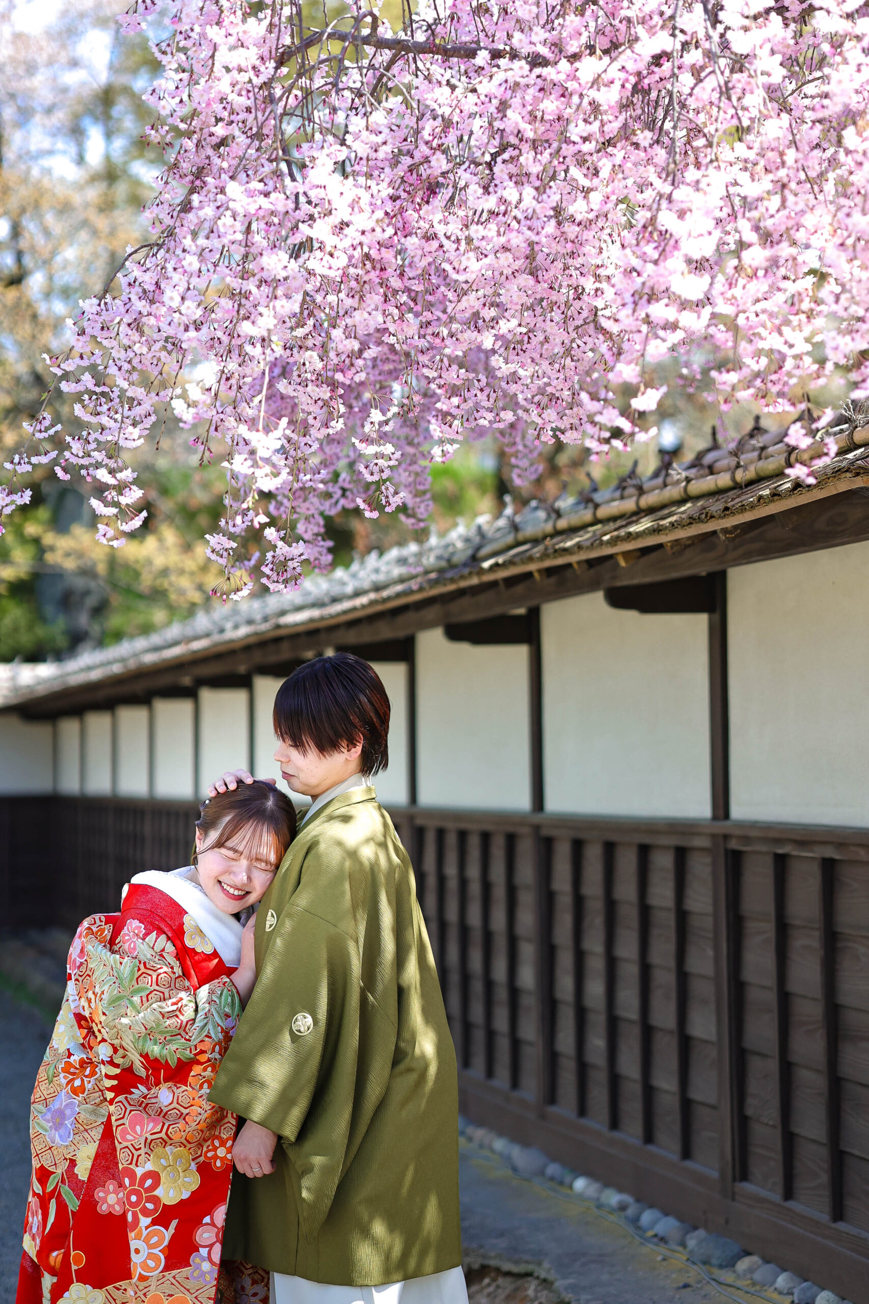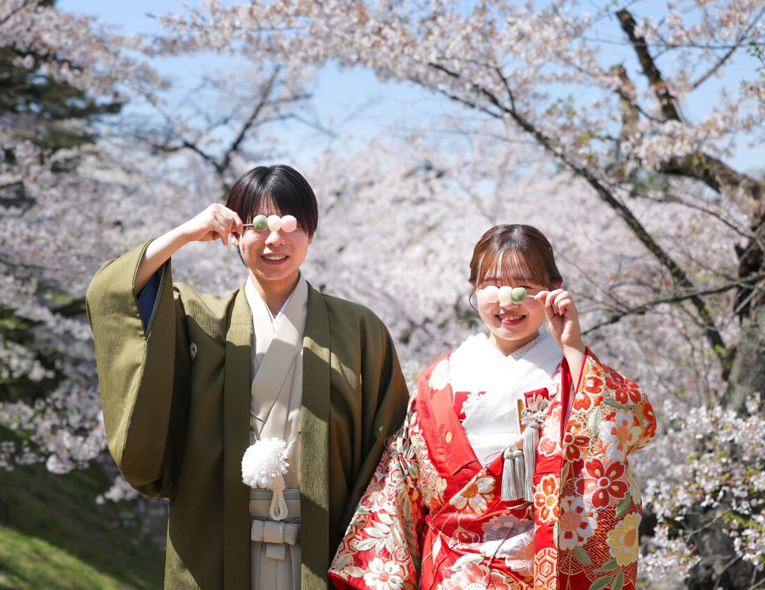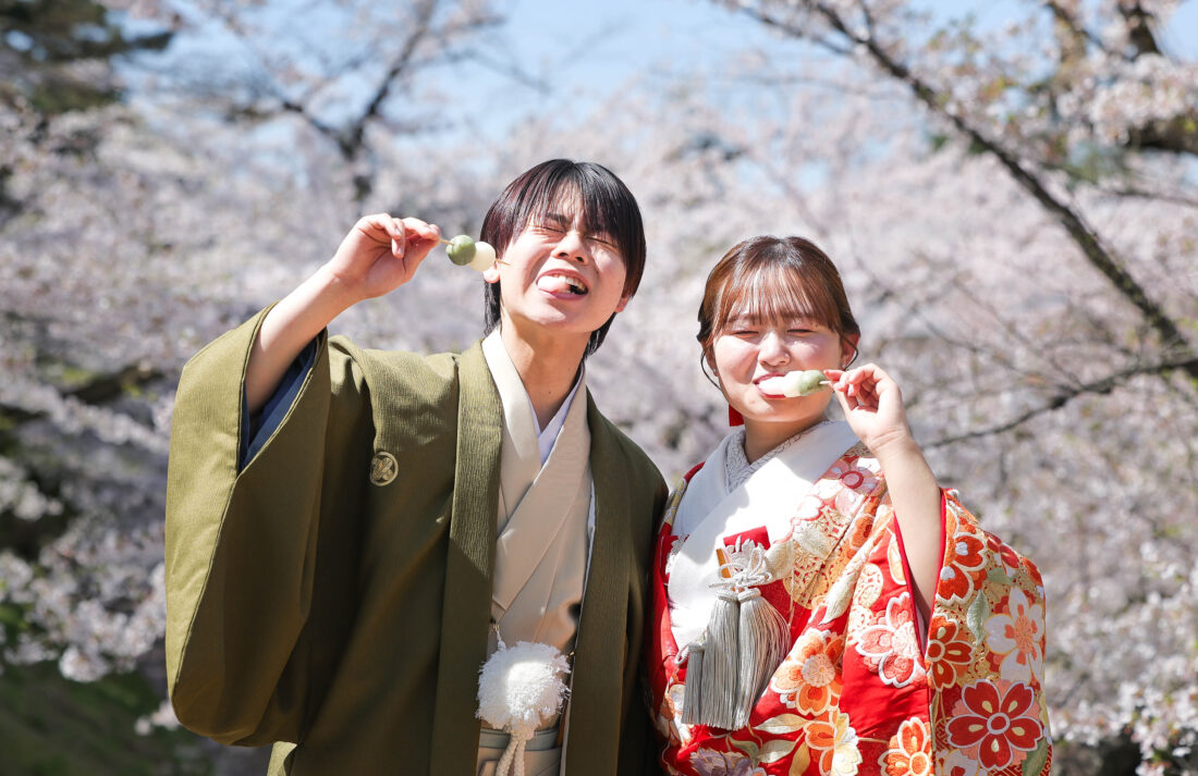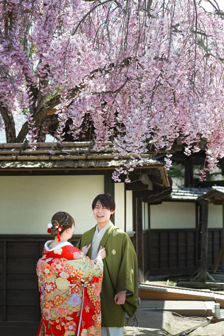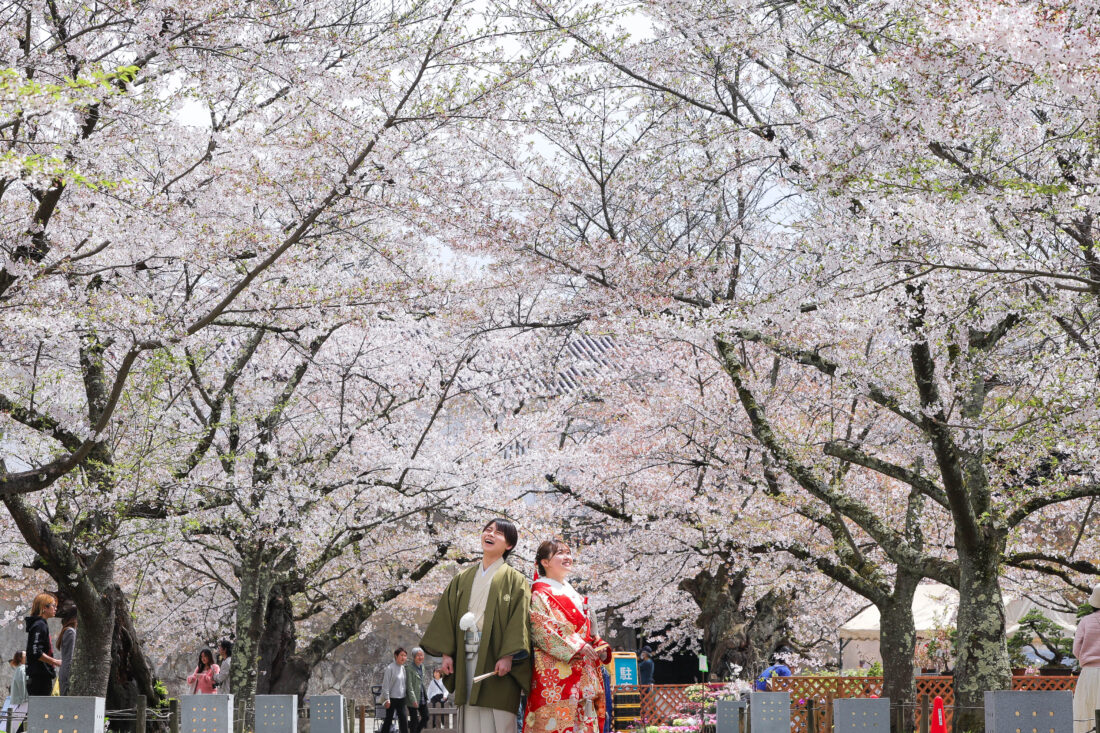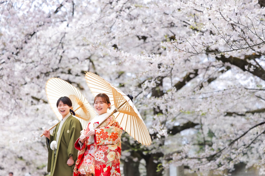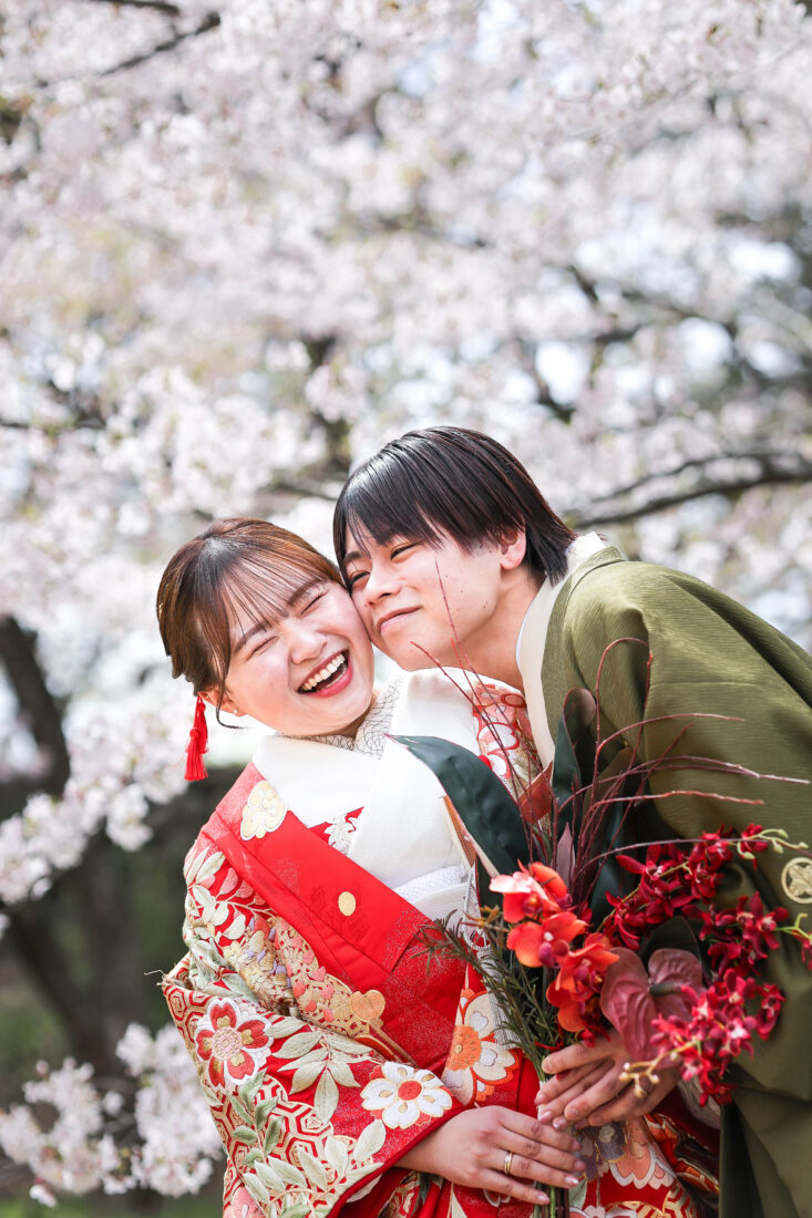 「駆け抜けた春!」 和装前撮りフォトウェディング ロケーションフォトドレス色打掛和装前撮りペットと一緒 来月の結婚式に先駆けての前撮り撮影心配していた桜もまだまだ見頃で『鶴ヶ城×桜』の夢が叶いましたお二人の可愛らしい笑顔と愛犬ロイくんの元気な走りっぷりに私たちも癒されました