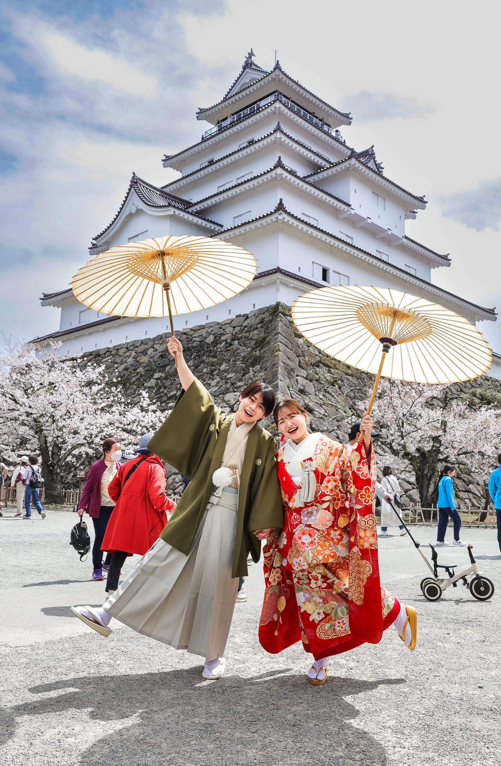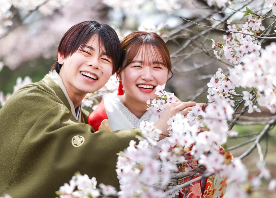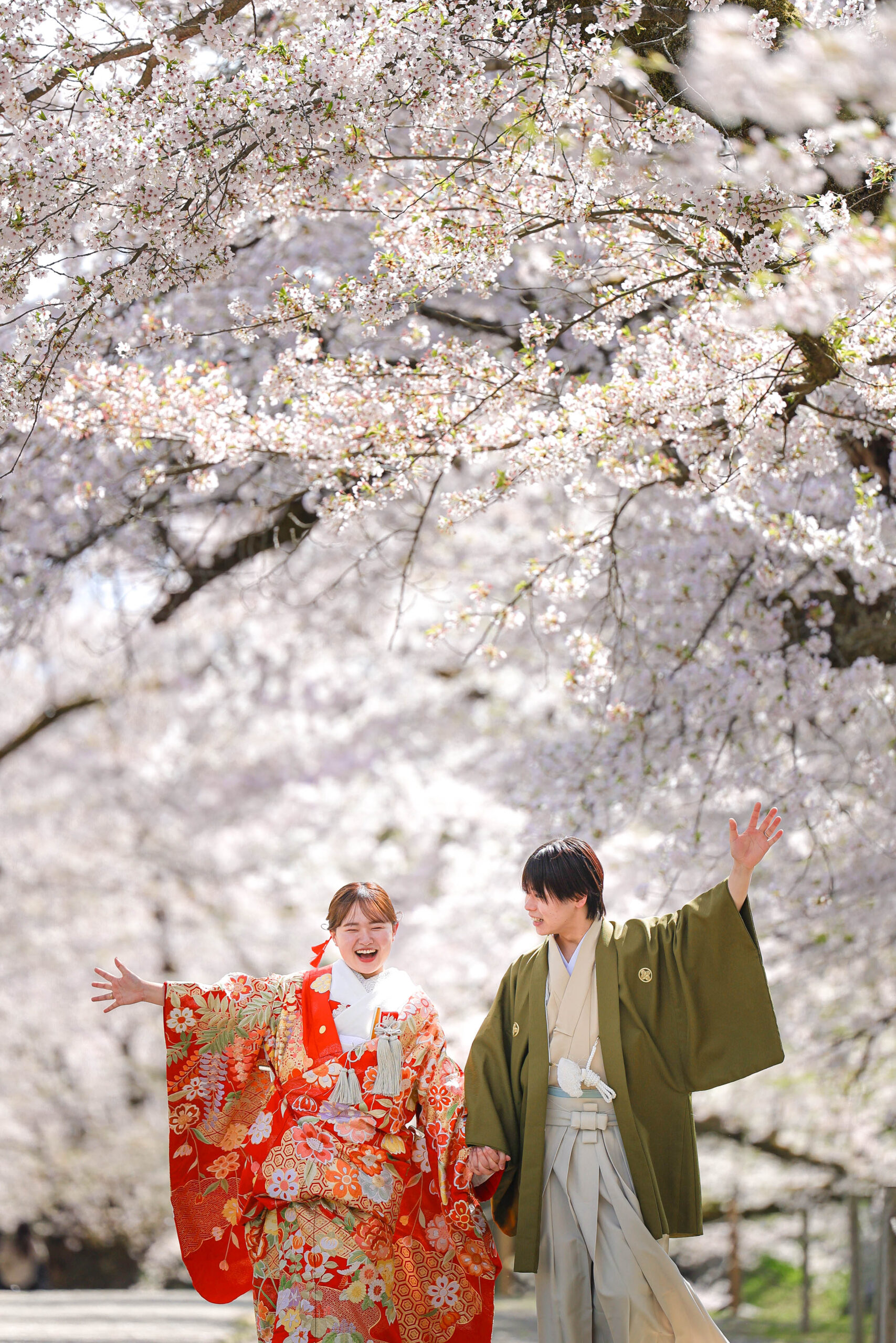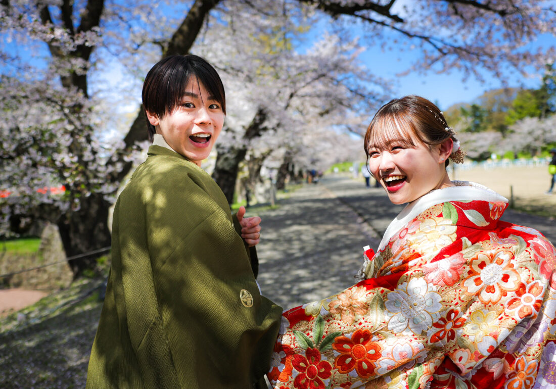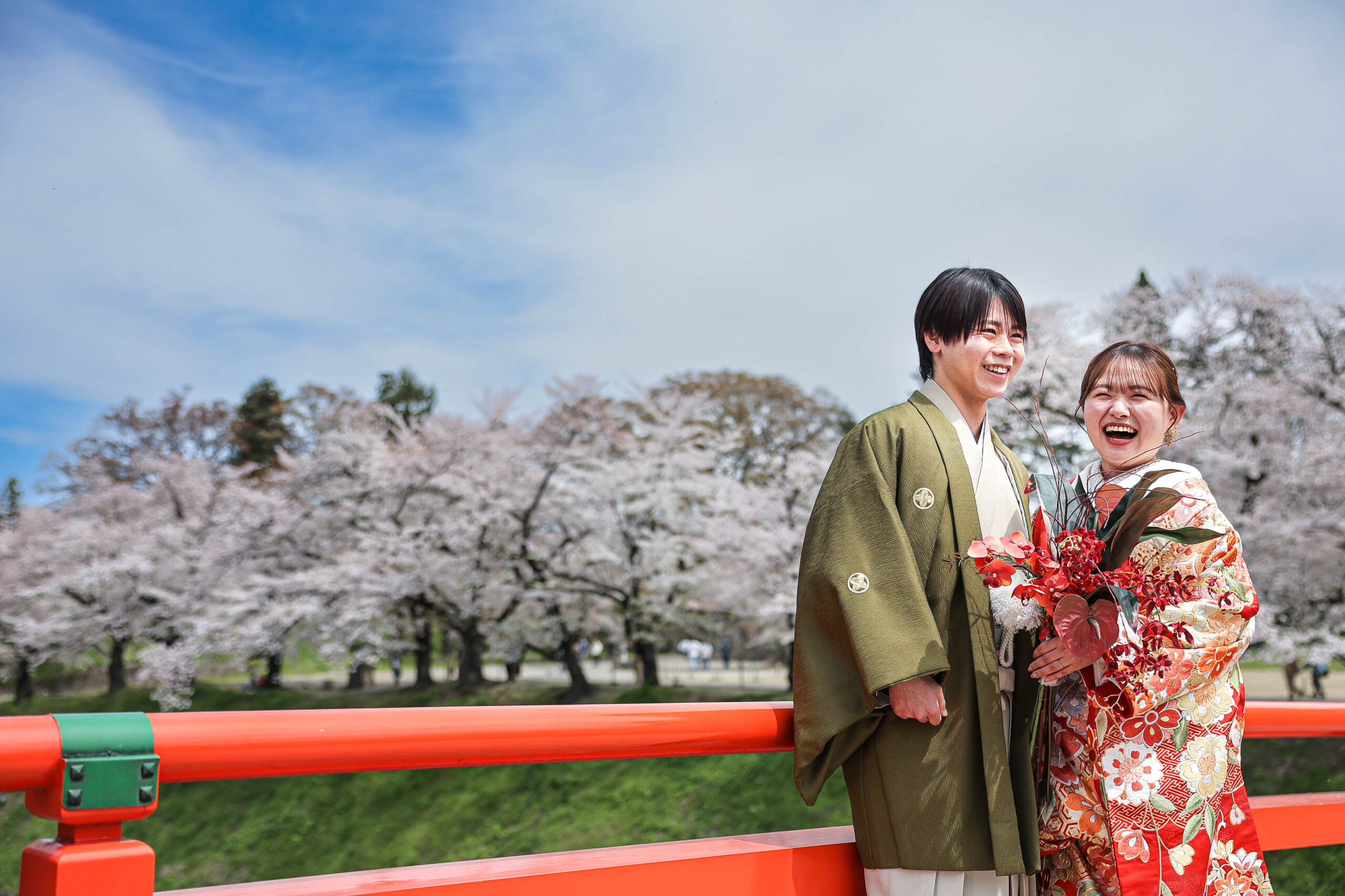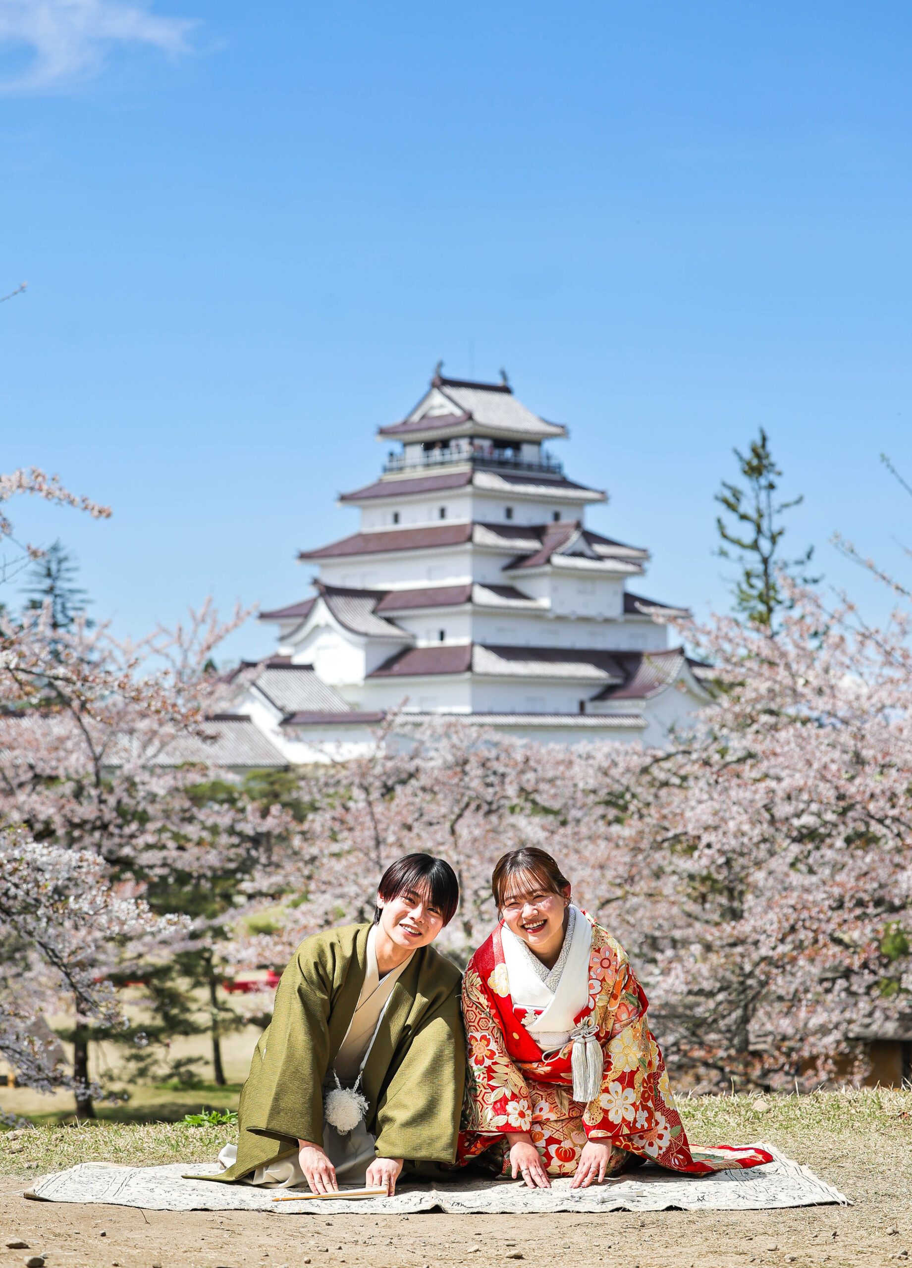 「駆け抜けた春!」 和装前撮りフォトウェディング ロケーションフォトドレス色打掛和装前撮りペットと一緒 来月の結婚式に先駆けての前撮り撮影心配していた桜もまだまだ見頃で『鶴ヶ城×桜』の夢が叶いましたお二人の可愛らしい笑顔と愛犬ロイくんの元気な走りっぷりに私たちも癒されました