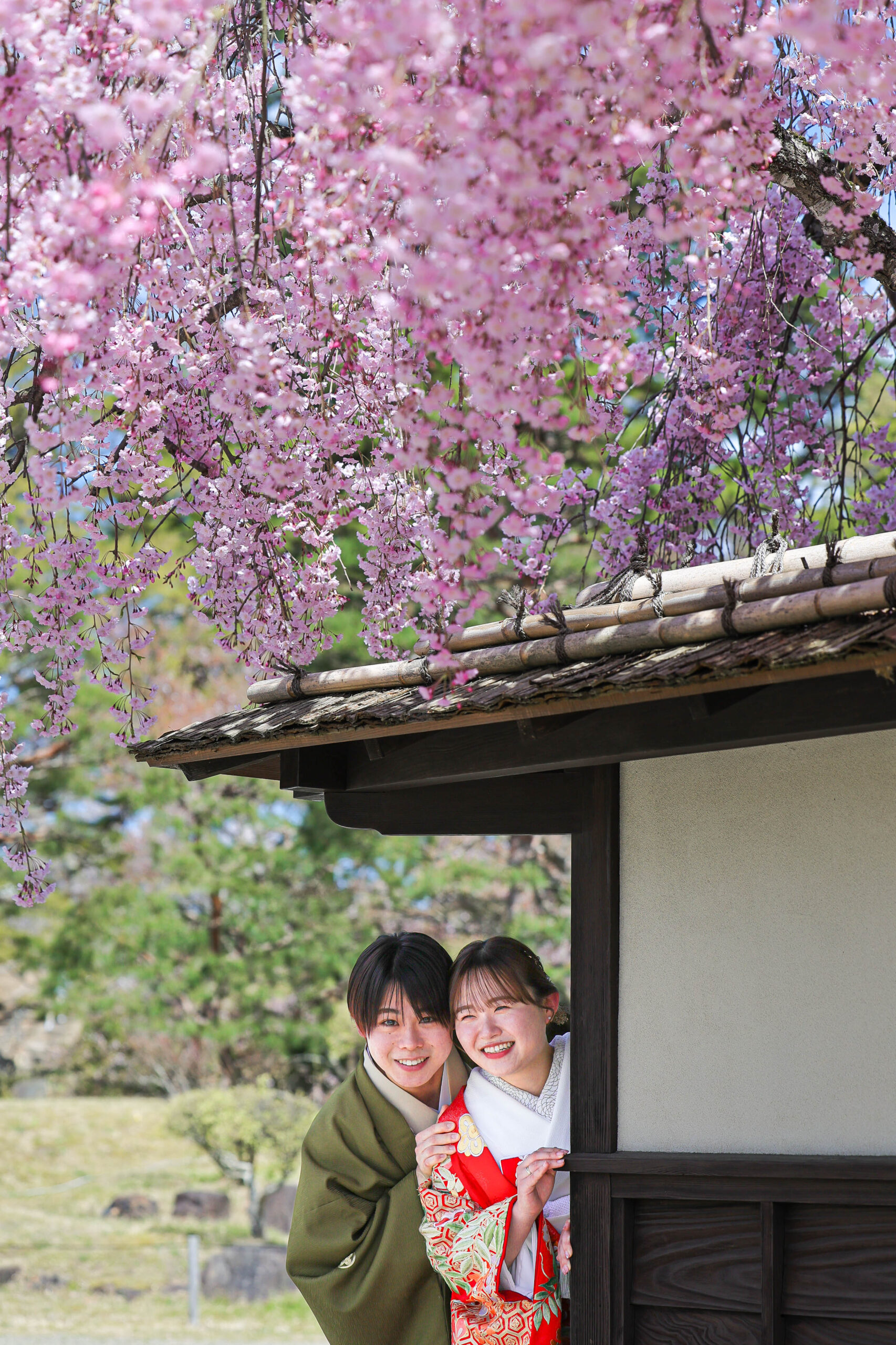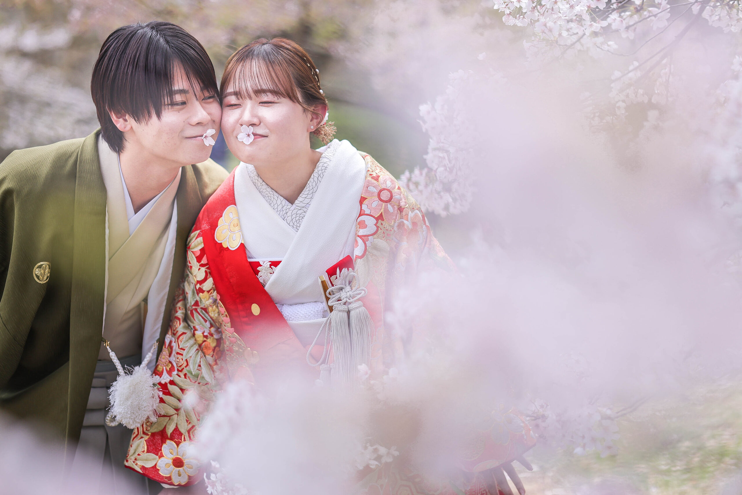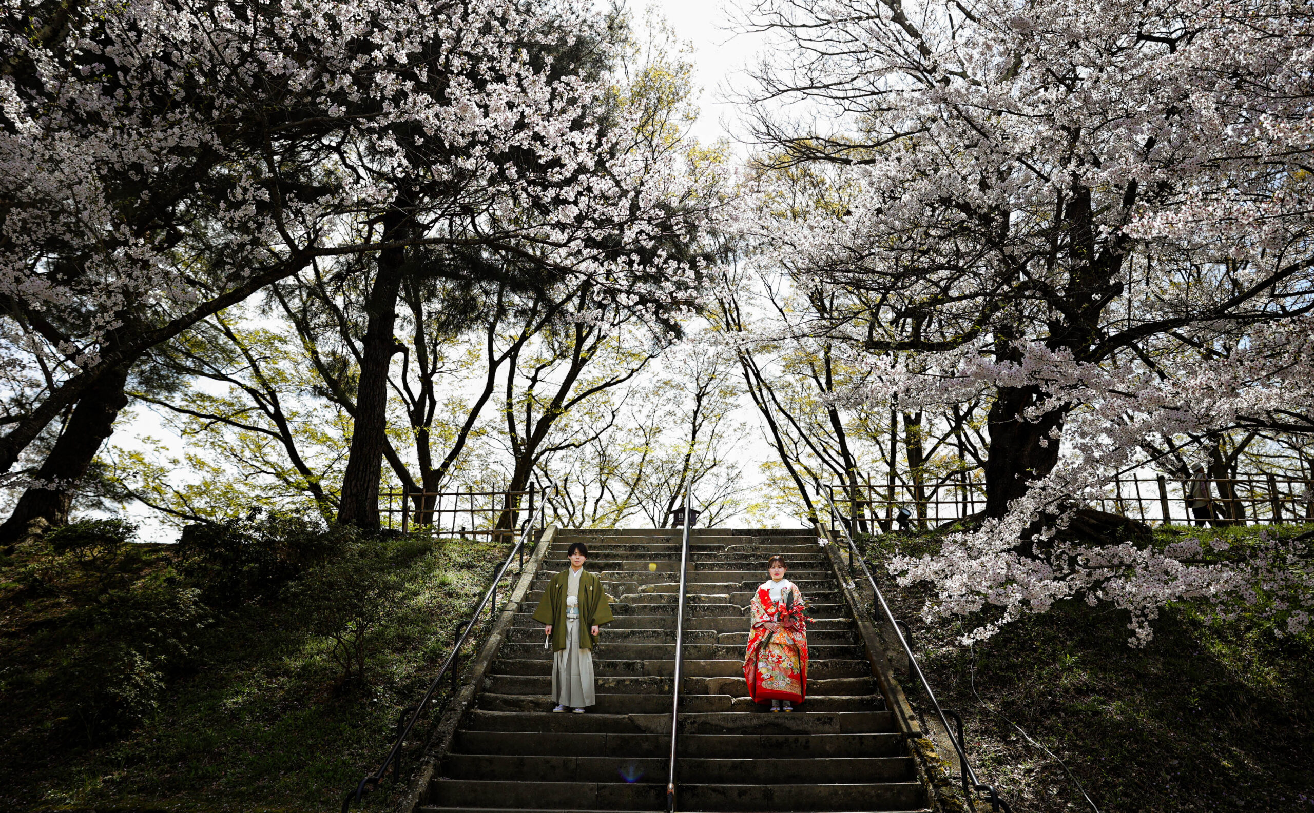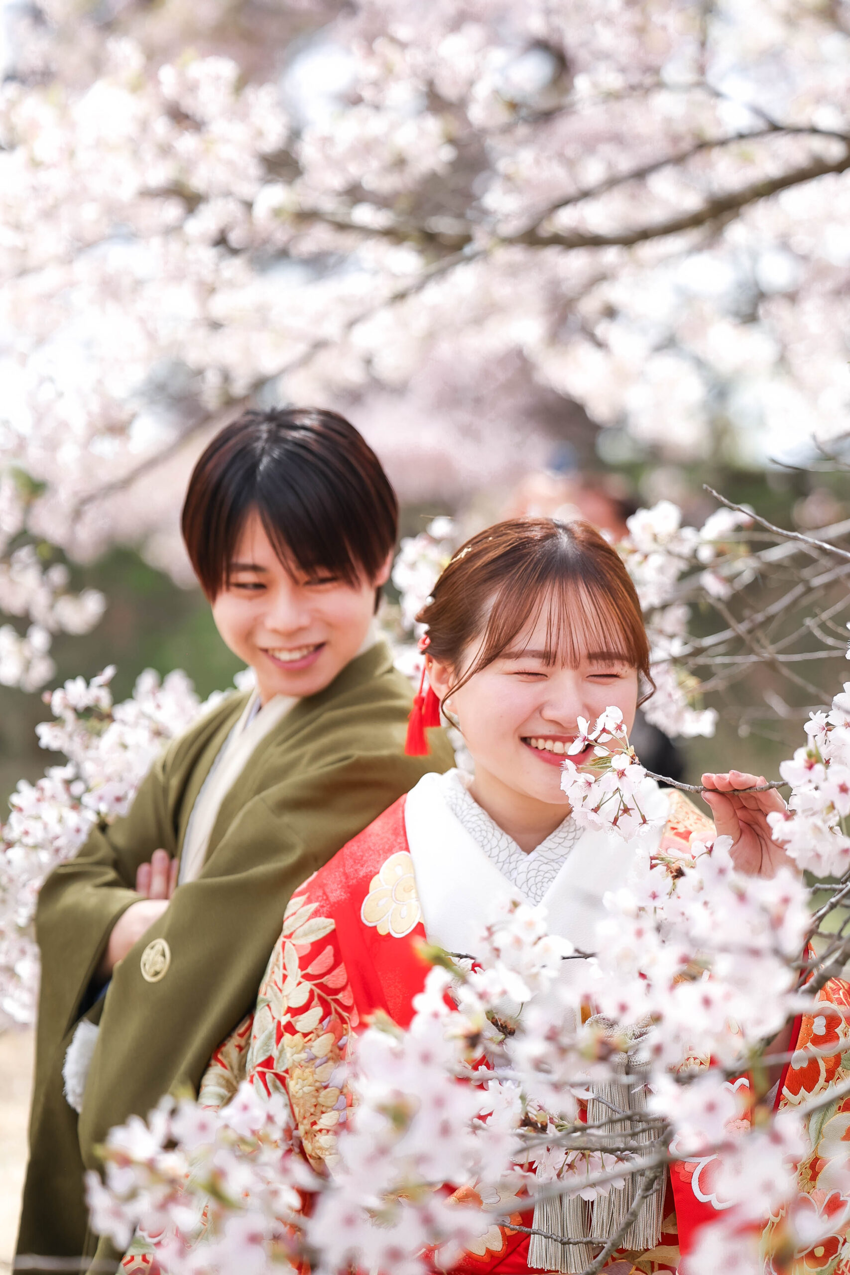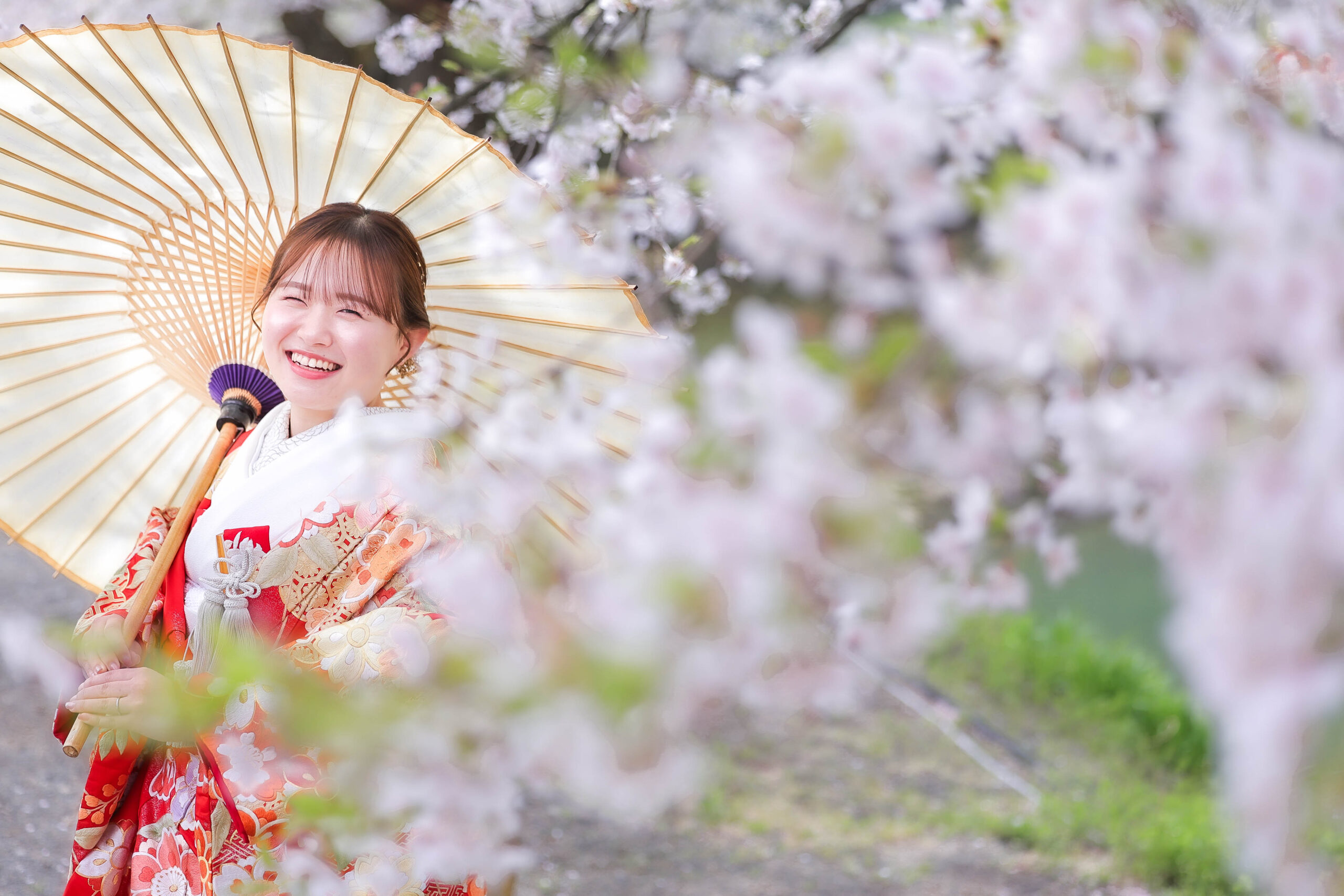 「駆け抜けた春!」 和装前撮りフォトウェディング ロケーションフォトドレス色打掛和装前撮りペットと一緒 来月の結婚式に先駆けての前撮り撮影心配していた桜もまだまだ見頃で『鶴ヶ城×桜』の夢が叶いましたお二人の可愛らしい笑顔と愛犬ロイくんの元気な走りっぷりに私たちも癒されました